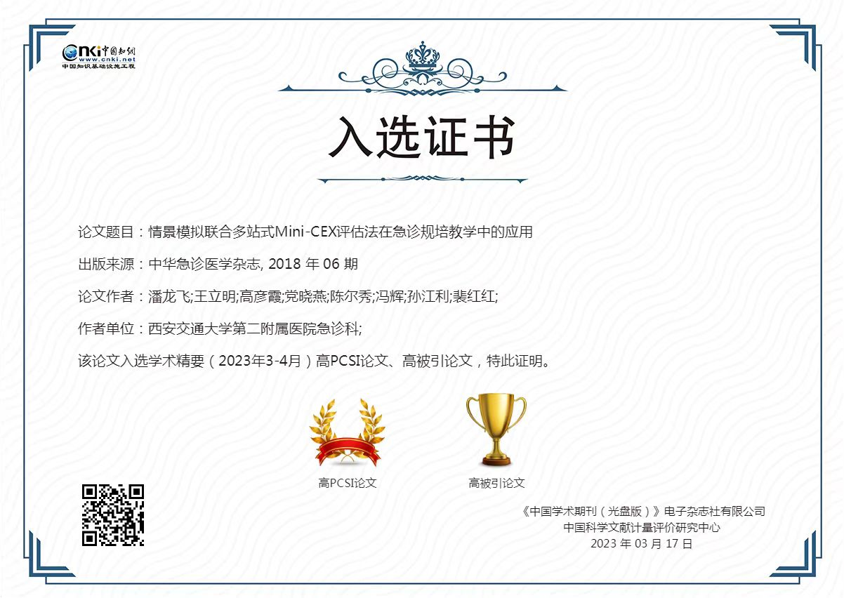 《情景模拟联合多站式Mini-CEX评估法在急诊规培教学中的应用》,2018年6月发表于《中华急诊医学杂志》,PCSI指数9.041,位列成人教育与特殊教育前1%(82/14815),医学教育与医学边缘学科前5%(280/23041)。