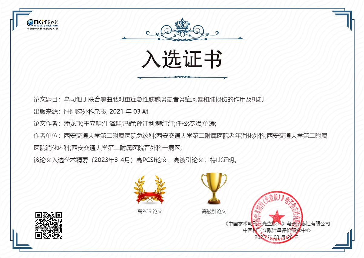 《乌司他丁联合奥曲肽对重症急性胰腺炎患者炎症风暴和肺损伤的作用及机制》,2021年3月发表于《肝胆胰外科杂志》,PCSI指数36.122,位列消化系统疾病0.1%(11/11642)。