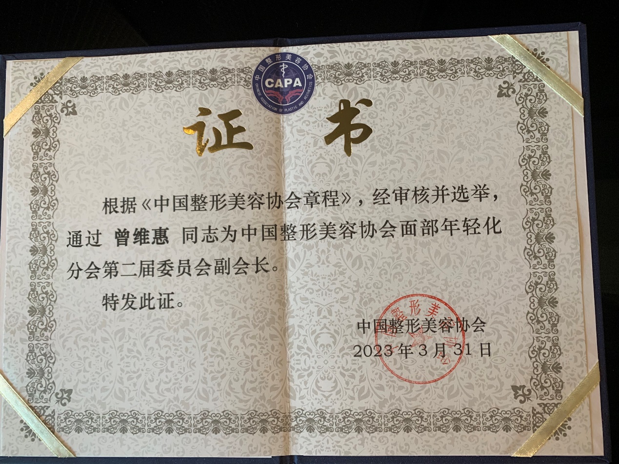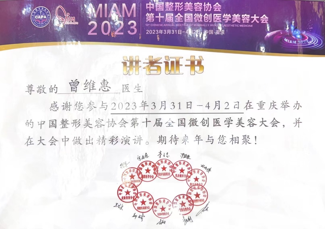 此次会议曾维惠教授还当选为中国整形美容协会面部年轻化分会第二届委员会副会长,这既是荣誉也是责任。激励我们二院皮肤人在发挥自身优势的同时,也不断开拓进取,为中国的微创医美事业添砖加瓦。同时也为皮肤病院学科发展和临床声誉贡献自己的一份力量。