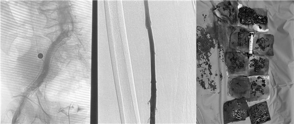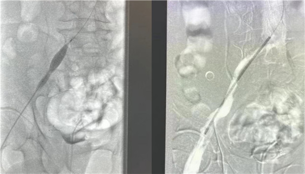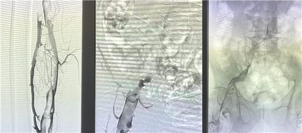 高大爷入院后立刻开启绿色通道,普外科血管介入团队放弃假期休息,当天急诊为他进行了介入手术治疗。为了防止肺栓塞的发生,首先为高大爷进行下腔静脉滤器的植入,与此同时造影显示患者左下肢血管内布满血栓,使用AcoStream血栓抽吸系统为患者清除血管内的血栓,高大爷还存在左侧“髂静脉压迫综合征”立刻完善方案,为他进行球囊扩张,支架植入,在保证患者的安全前提下,采用“一站式”解决方案,一次性为高大爷从病根上解决诱发血栓的原因并治疗了血栓,即刻效果显著,高大爷下肢大腿腿围术前43厘米,术后即刻41.5厘米,术后第一天41厘米,小腿腿围术前34厘米,术后即刻32厘米,术后第一天31厘米。同时也避免可能的PTS发生。介入手术创伤小,仅有一个穿刺点,患者术后恢复快,大大的提高了患者的就医感受,并且为患者节省了费用。
