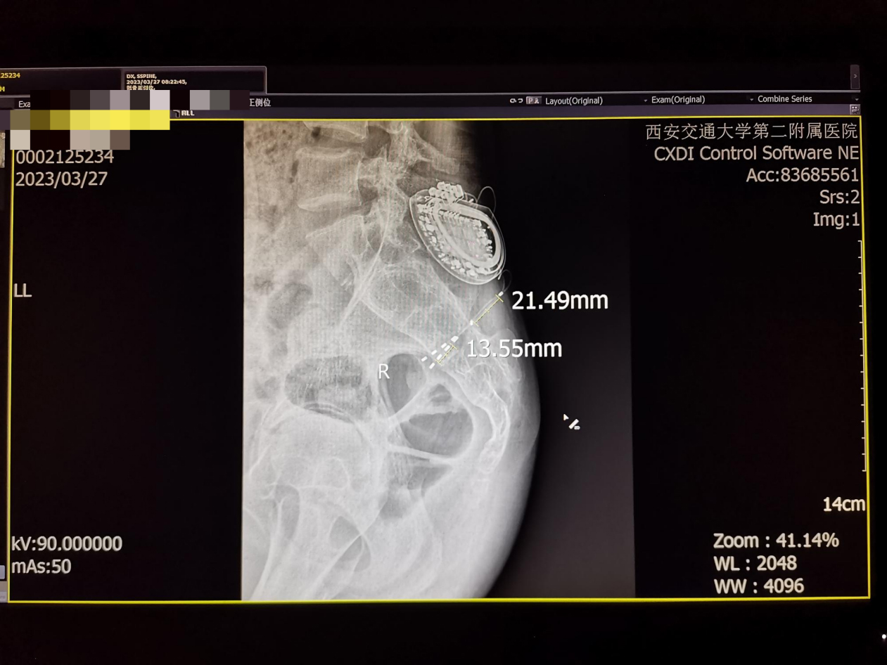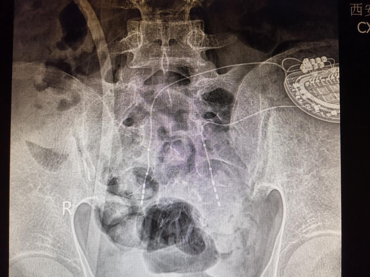 患者经14天体验治疗,排尿、排便显著改善,漏尿减少,排便成形,会阴部及肛门持续的紧缩感彻底缓解。患者本人及患者父母都非常开心,认识到骶神经调控疗法的先进与自身疾病的复杂及今后漫长的治疗,接受二期植入永久刺激器。种铁教授却有更深一层的考虑,小赵才21岁,未来的日子还长,植入永久刺激器几年后需要更换新电池,难道后半生要反复进行手术来更换电池?这对患者的生活和经济都是很大的负担。征得患者及家人同意,在医院领导的大力支持下,选用了目前国际前沿的可充电双电极骶神调控系统。