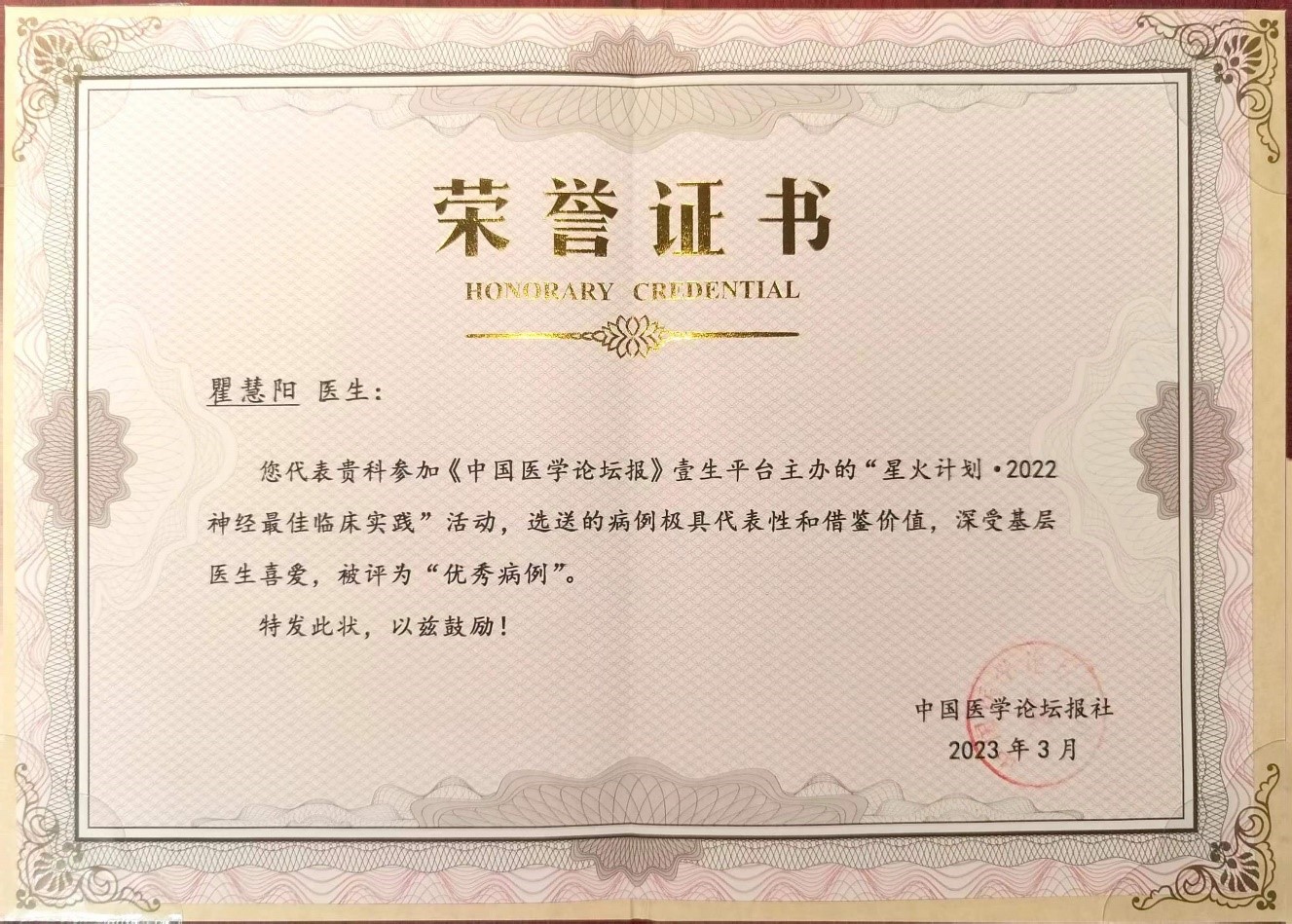 近日,国家卫生健康委员会主管的《中国医学论坛报》壹生平台举办了《星火计划-2022神经最佳临床实践》优秀病例评选活动,我院神经内科张桂莲教授团队荣获“星火计划2022神经最佳临床实践突出贡献奖”,参评病例被评为“优秀病例”。该病例由展淑琴主任医师全程指导,瞿慧阳住院医师负责汇报,于2022年12月27日在“壹生APP”正式发布。