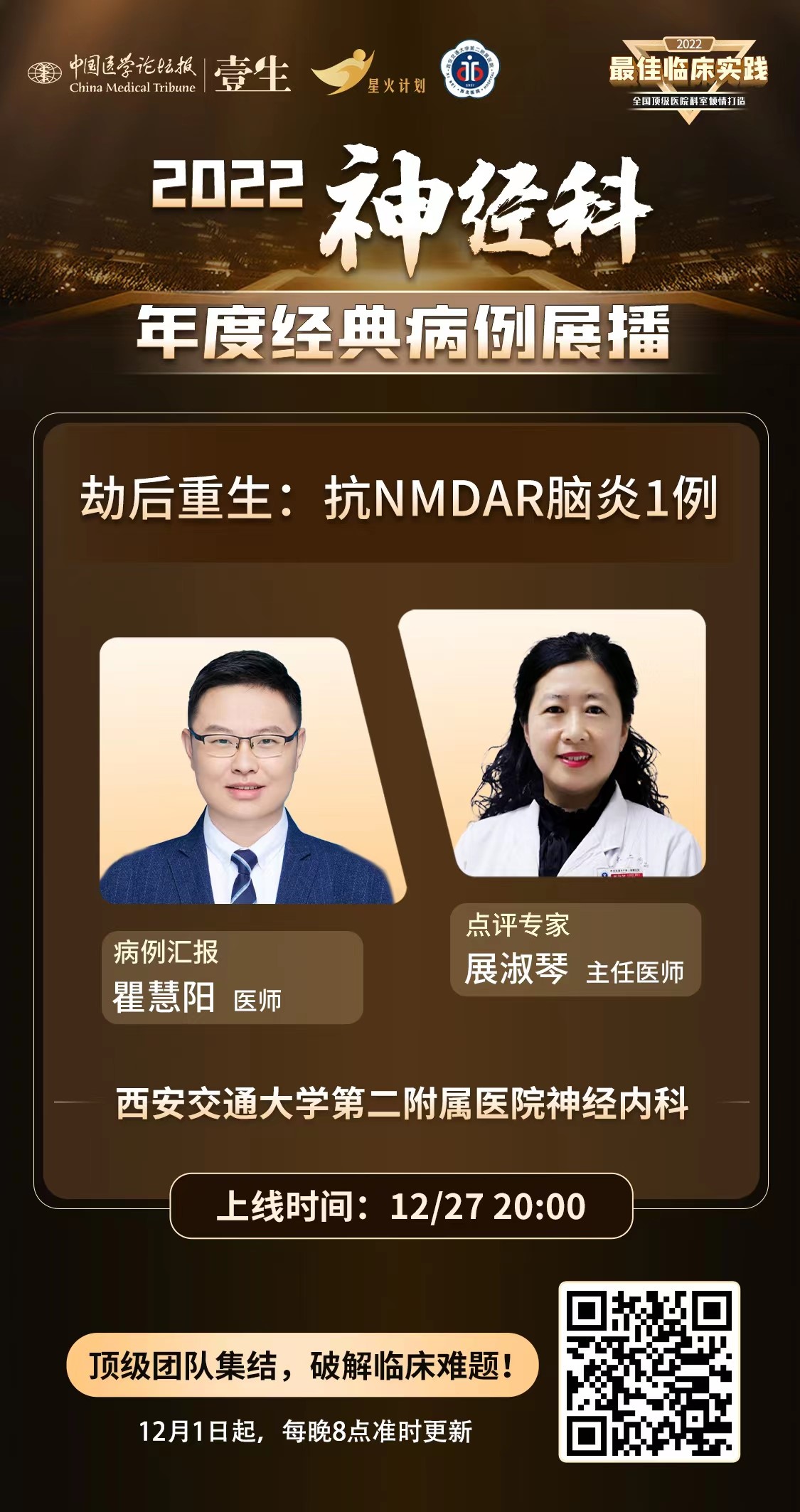 瞿慧阳医师展示了一例抗NMDAR自身免疫性脑炎,该患者临床病情十分凶险,进展迅速,短期内出现了呼吸循环衰竭,最终在多学科的全力救治下转危为安,最终康复出院。展淑琴主任医师用简明的语言总结了该类疾病的诊断要点以及关键治疗措施。壹生平台认为该病例极具代表性和借鉴价值,展现了我院极高的诊疗水平和综合救治能力。