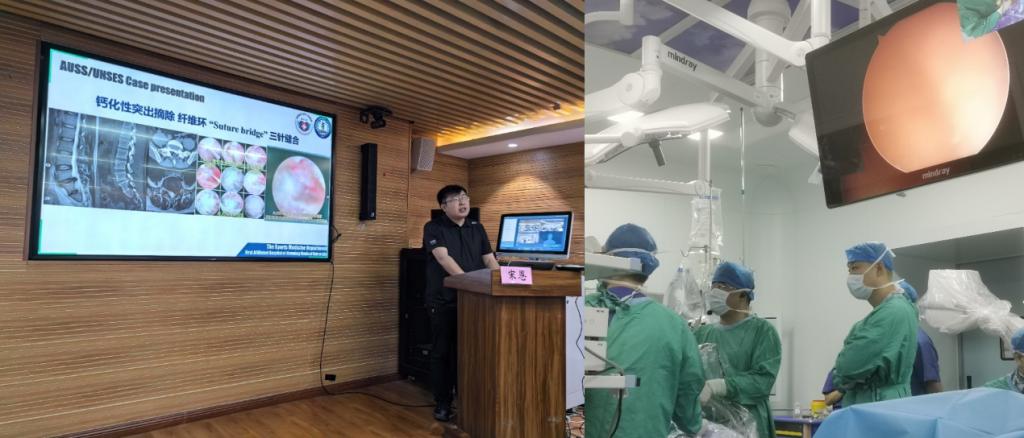 随后昆明医科大学第一附属医院宋恩教授首先带来《AUSS技术的应用概述及前景》,详细介绍了AUSS技术的起源与发展。骨科中心脊柱与骨肿瘤病区王栋主任随后带来《AUSS技术的规范应用》,详尽介绍了AUSS的操作流程与细节。骨科中心脊柱与骨肿瘤病区王瑞博士及欧阳鹏荣博士汇报手术演示病例后,由王栋主任和宋恩教授分别进行AUSS技术下镜下融合及ULBD减压的手术实战操作演示。