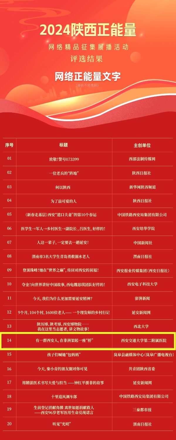 近日,由中共陕西省委网信办主办的2024陕西正能量网络精品征集展播活动,经过公开征集、专家评审等环节,公布上榜的100 件网络正能量精品,我院《有一群西安人,在非洲架起一座“桥”》入选“网络正能量文字”。