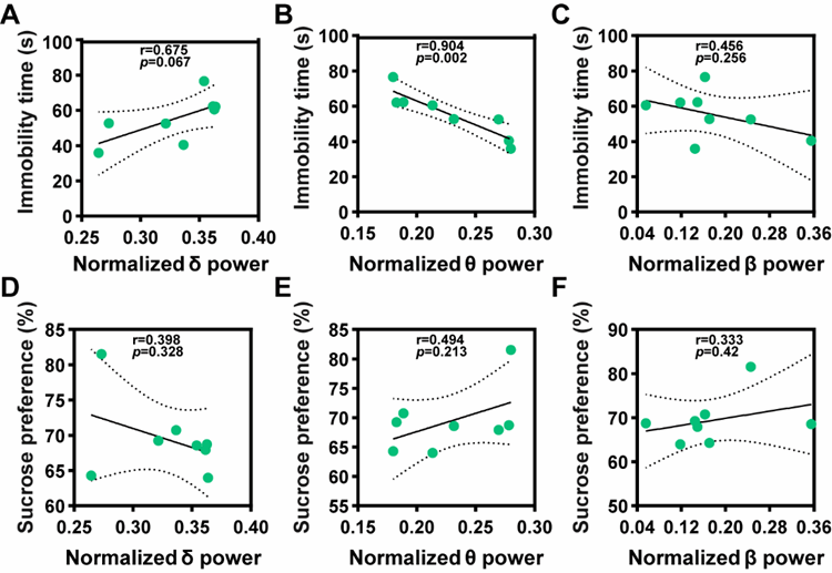 图5接受iTBS后PD模型大鼠抑郁样行为变化与mPFC内δ、θ、β节律标准化功率的相关分析结果