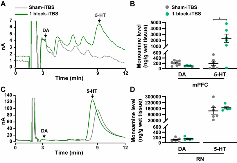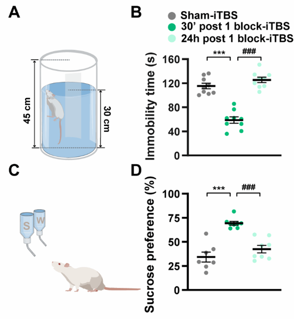PD相关抑郁是PD常见的非运动系统症状之一,严重影响患者生活质量;该疾病的发生与mPFC内异常的神经震荡活动变化以及5-HT递质系统密切相关。尽管选择性5-HT再摄取抑制剂和认知行为疗法是PD相关抑郁的常规疗法,但是由于缺乏充足的证据支持这些治疗手段的有效性,目前依然迫切需要探寻新颖的治疗手段。作为一种更加优化的高频经颅磁刺激模式,iTBS已被发现可能改善PD相关抑郁症状;然而,iTBS是否通过调节mPFC内的神经震荡活动和5-HT水平继而改善PD相关抑郁依然尚不清楚。基于此,本研究采用健康雄性Sprague-Dawley大鼠建立6-羟基多巴胺损毁的PD模型并采用强迫游泳、蔗糖偏好等行为学测验探究短期iTBS对PD模型大鼠的抑郁样行为的调节作用;此外,为了进一步探究该调节作用背后的神经生物学机制,本研究采用在体局部场电位(local field potential,LFP)记录和神经化学实验观察短期iTBS对mPFC内神经震荡活动变化以及5-HT水平的效应。