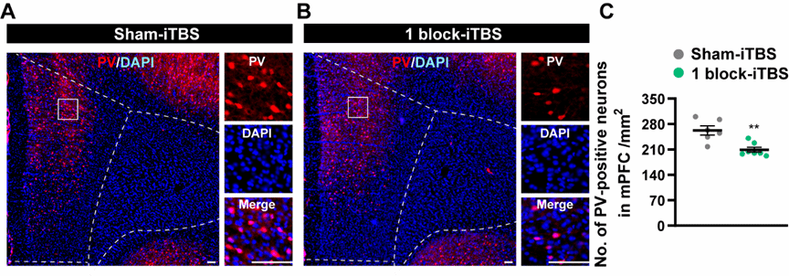 图4接受假刺激或iTBS后PD模型大鼠mPFC内PV阳性神经元的平均密度变化