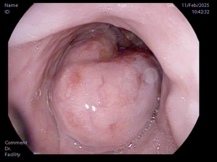 患者于1年前因酒后胃部不适就诊,超声胃镜及胃镜检查发现食管隆起性病变,考虑为黏膜下层起源囊性占位。4个月前,患者出现饭后饱胀、反酸烧心及轻微吞咽不畅症状,1个月前复查胸部及上腹部增强CT,提示食管下段管腔内乏血供占位,考虑良性病变可能。鉴于患者近4月食欲不佳、体重减轻3kg,消化内科早癌团队经审慎商讨,决定为患者实施ESD术。