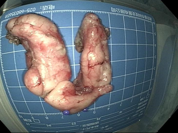 然而,在邹百仓教授的带领下,消化内科早癌手术团队凭借丰富的经验和精湛的技艺,有条不紊地推进手术。术前,超声内镜发挥了关键作用,精准定位病变起源于固有肌层浅层,为手术方案的制定提供了重要依据。术中,医生们在内镜下小心翼翼地操作,逐步分离病变组织,最终完整切除肿瘤,并精心缝合创面。整个手术过程顺利,标本呈U型完整取出。