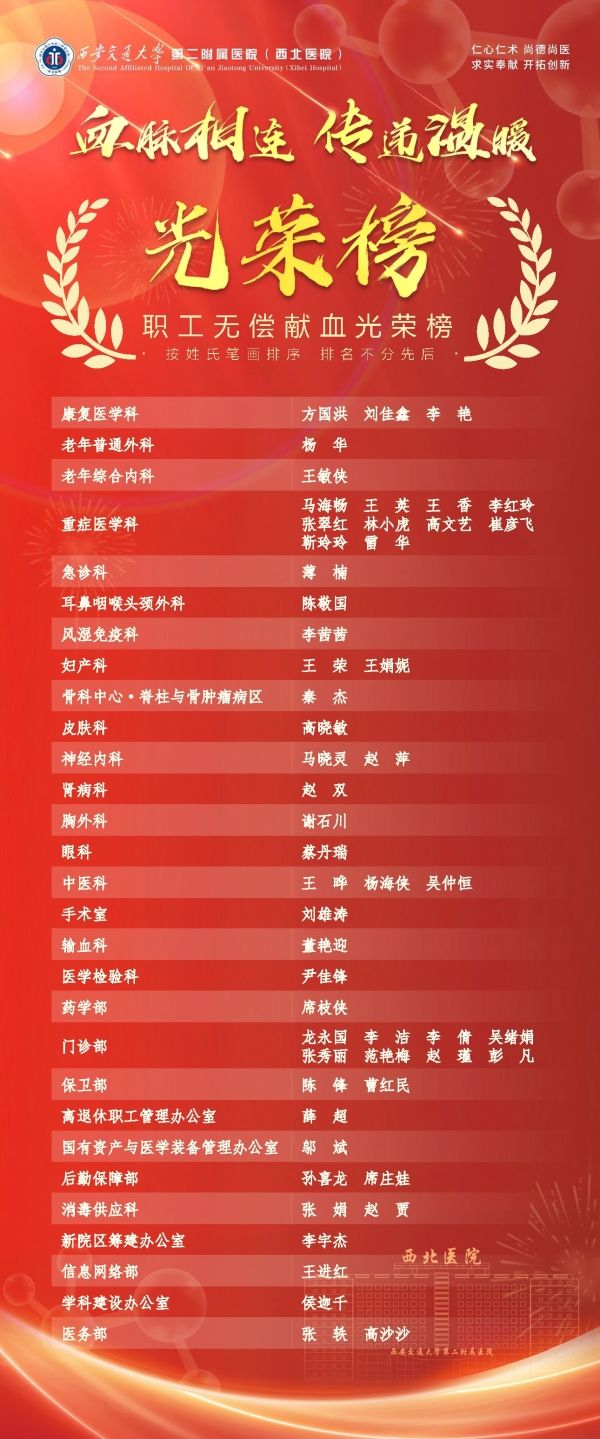 此次无偿献血活动不仅展现了我院职工的高尚品德和社会责任感,也为缓解西安市用血紧张局面作出了积极贡献。我院将继续秉承“仁心仁术 尚德尚医 求实奉献 开拓创新”的院训,积极履行社会责任,为守护人民群众的生命健康贡献力量。