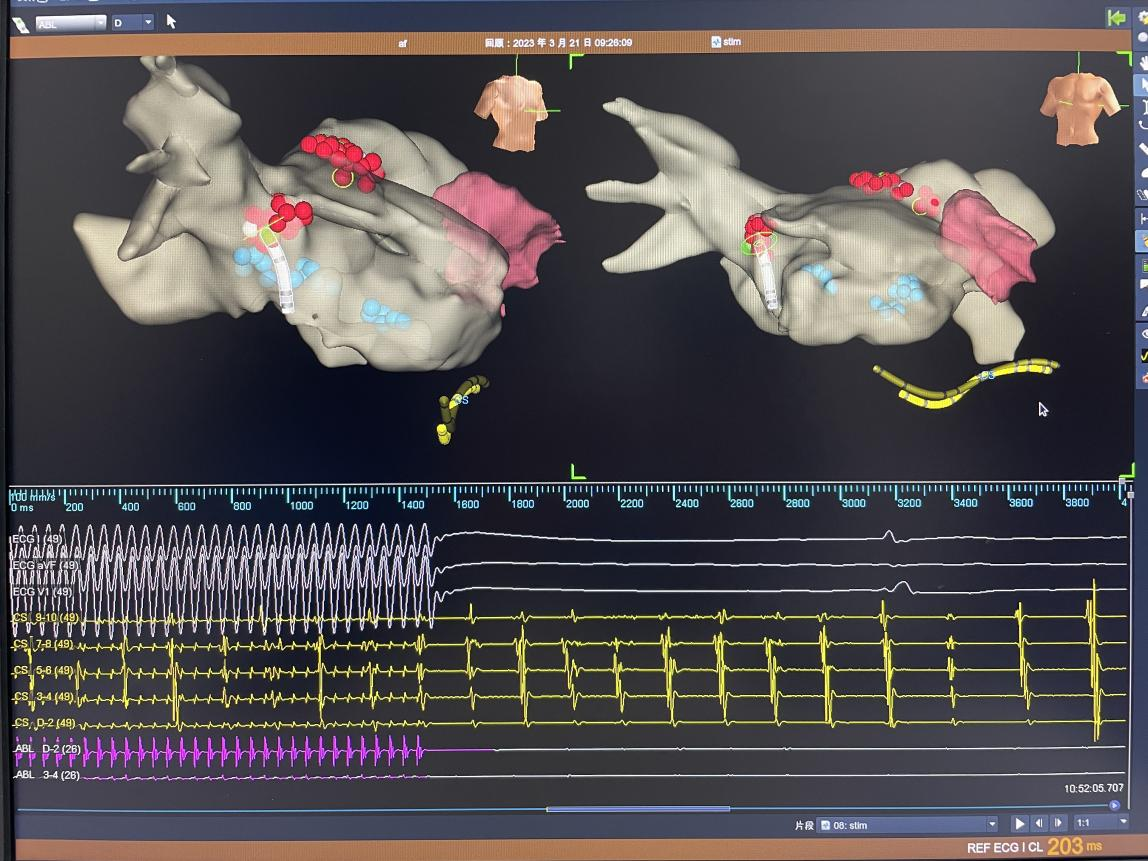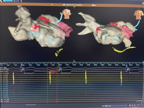 术中,对患者进行左心房三维建模,标测到患者静息情况下PR间期明显延长,同时伴有二度房室传导阻滞。