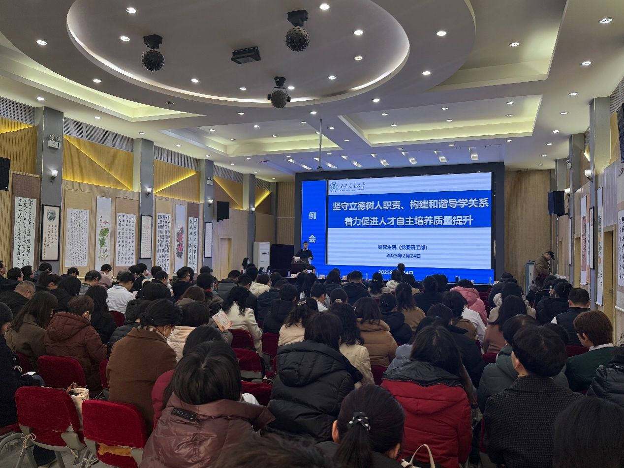 薛周利副院长做了题为《坚守立德树人职责、构建和谐导学关系,着力促进人才自主培养质量提升》的专题报告,分为立德树人根本任务、构建和谐导学关系、研究生思政工作概况三方面。