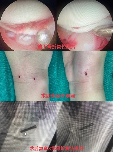 该患者为年轻女性,外伤后出现腕部疼痛,初次就诊按“腕部扭伤”治疗,但效果不佳,后就诊于倪建龙副主任医师门诊,经过仔细查体,考虑腕舟状骨骨折,行CT检查后确诊,入院后时志斌主任、倪建龙副主任医师团队经过讨论,认为患者为年轻女性,应尽量减少手术创伤,而传统手术需要作5~8cm的切口,结合既往我科腕关节镜下手术的成功经验,决定为其进行腕关节镜辅助复位+经皮空芯螺钉内固定术,最终手术顺利完成,患者已出院继续康复。