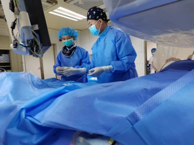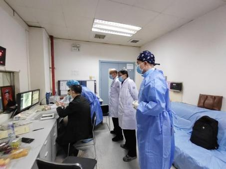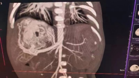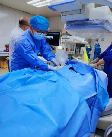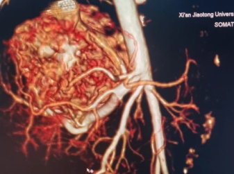 患儿妈妈怀孕期间产检发现肝脏占位,血运丰富,并随着时间的推移,肝脏占位逐渐变大,孕38+5周外院彩超提示肝脏肿块增长至7.3*4.3cm。宝宝出生后第一天即出现拒乳、呼吸困难、心率快等表现,考虑宝宝的情况为肝脏的血管瘤并有肝动-静脉瘘,引起心脏持续高动力状态,导致心功能不全,这是一种能够危急患儿生命的紧急情况,需要及早干预治疗,家属遂即慕名转至我院新生儿科。入住新生儿科后王惠萍教授紧急联系B超室乞艳华副教授完善心脏以及肝脏彩超评估患儿心功能以及瘤体大小,宝宝的肝脏占位正逐渐增大,心功能逐渐恶化,留给家属和医生的时间正在减少;小儿外科高亚教授心系患儿安危,多次查看、询问患儿情况,并根据每次复查指标,作出指示:决定使用微创介入的方式进行肝动脉栓塞术,封堵肿瘤血供。但新生儿血管纤细,动静脉瘘广泛,新生儿设备、管路、用药禁忌等诸多难题,成功的案例国内外鲜有报道,西北地区尚无类似病例报道。为了给患儿争取生存的机会,组织影像科介入组、小儿外科、麻醉手术科、医用超声科、新生儿科等院内多学科MDT团队进行了评估以及手术方案讨论, 反复论证手术的可行性,提出手术可能存在的风险以及应急策略并做好充分准备。