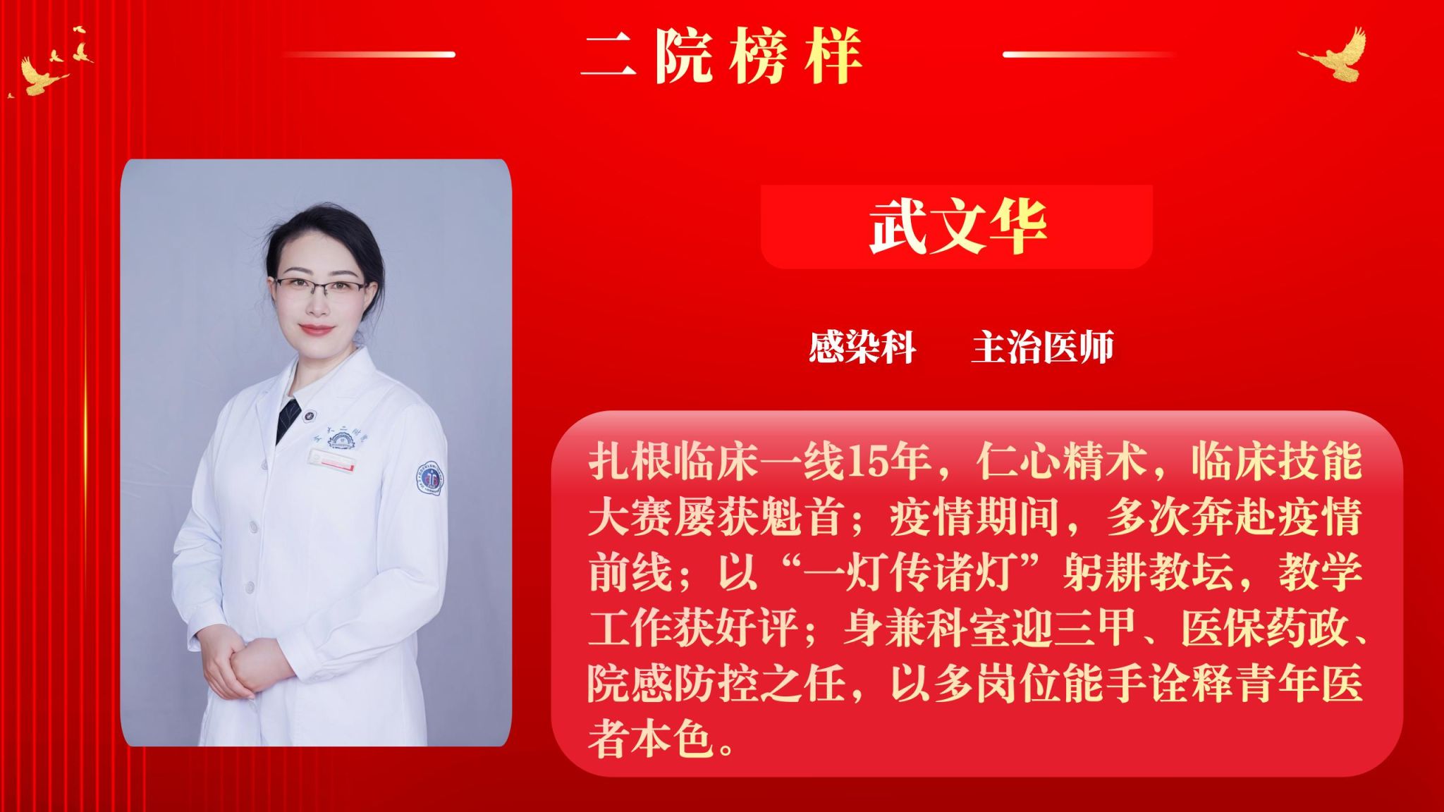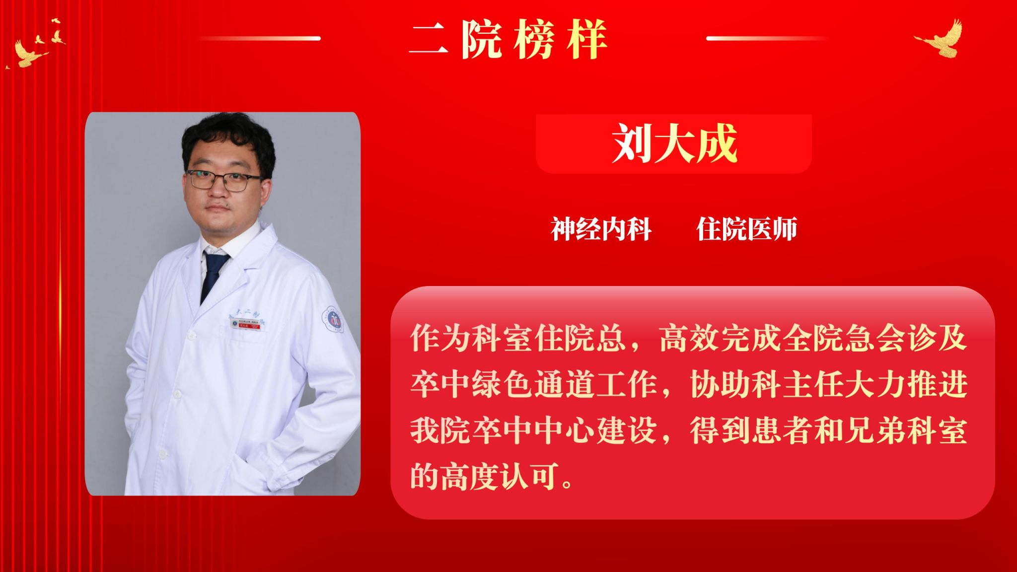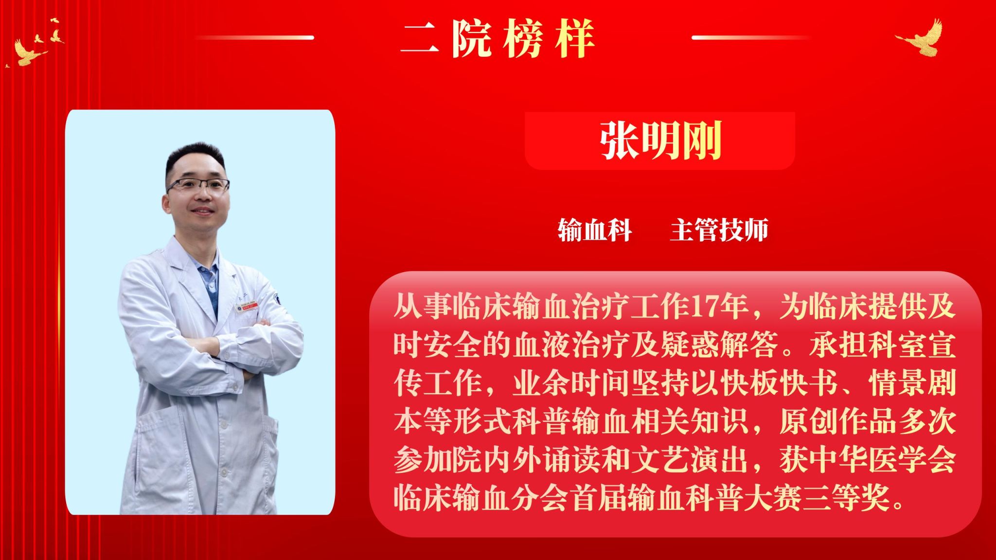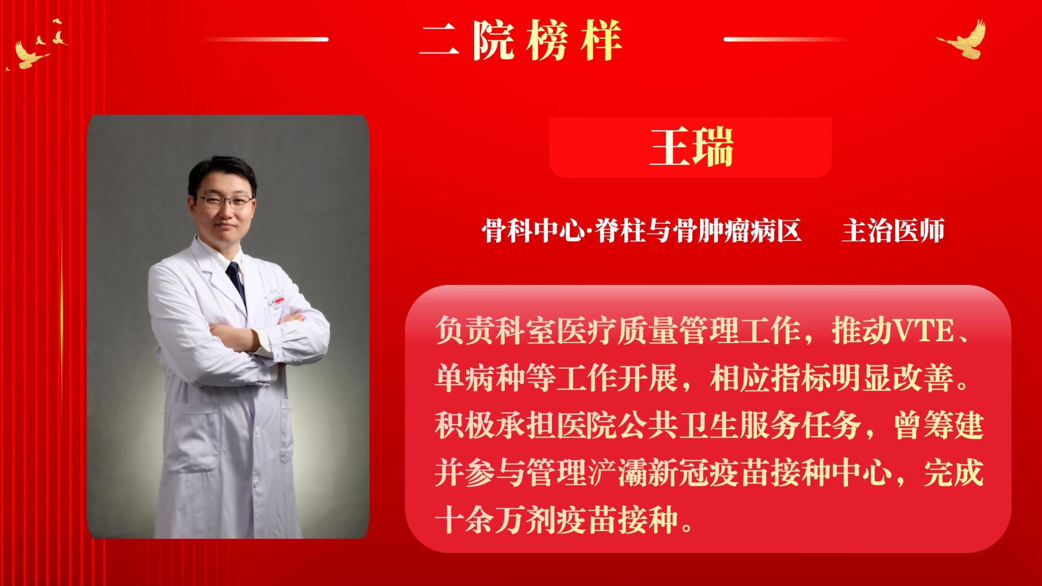 仰望星空有对标,脚踏实地有行动,平凡的是岗位,不凡的是精神。此次“二院榜样”月度人物共评选出10名,他们分别是:骨科中心·脊柱与骨肿瘤病区主治医师王瑞、眼科教辅冯海晓、神经内科住院医师刘大成、血管外科助理研究员关昊、门诊部护师杜超、全科医学科住院医师李静、呼吸与危重症医学科主管护师杨姣、内分泌代谢科助理研究员汪宁、输血科主管技师张明刚、感染科主治医师武文华。