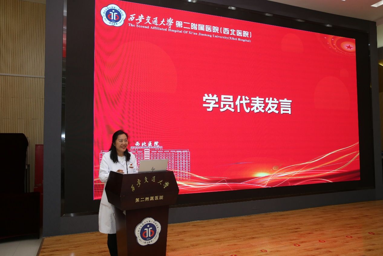 党变玲副书记在致辞中表示,我院在中西医协同诊疗方面有着悠久历史,作为中西医协同“旗舰”医院项目建设单位,“西学中”是建设中医药人才队伍的重要抓手。在陕西省中医药大学继续教育学院的鼎力支持下,“西学中”工作顺利开展。党变玲副书记勉励全体学员,要以“空杯心态”投入到学习中,将中医经典与临床经验相结合,将中西医协同融会贯通。