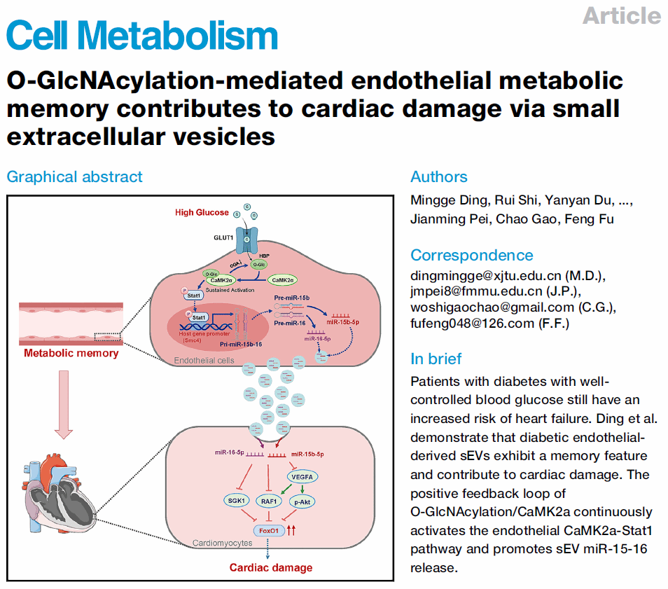 我院老年心血管病科丁铭格主任课题组长期从事心肌病与心衰研究,近年在Redox Biology(2021, 2022, IF=10.7)、Journal of Advanced Research(2023, IF=11.4)发表系列研究成果。近日,该课题组在糖尿病心衰领域取得重要进展,研究成果以长文(Article)形式发表于Cell大子刊Cell Metabolism(IF:27.7),题为“O-GlcNAcylation-mediated endothelial metabolic memory contributes to cardiac damage via small extracellular vesicles”。该研究首次揭示,高血糖诱导的内皮细胞代谢记忆通过细胞外小囊泡(sEV)miRNA的持续释放,驱动糖尿病心脏病不可逆进展,为破解“血糖控制良好却仍发生心衰”的临床困境提供了答案。