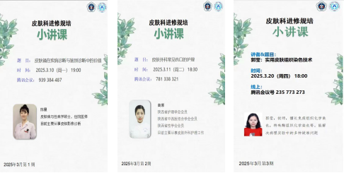 进行系列线上小讲课。皮肤科定期参加西安交通大学线上小讲课,学习分享《皮肤镜在疾病诊断与鉴别诊断中的价值》《皮肤外科常见伤口的护理》等内容。