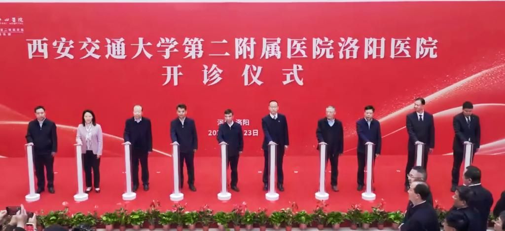 2025年3月23日,西安交通大学第二附属医院洛阳医院举行开诊仪式。西安交通大学副校长单智伟,西安交通大学原副校长颜虹,河南省卫健委党组成员、副主任李红乐,时任洛阳市委副书记、政法委书记张玉杰,副市长王国辉,西安交通大学第二附属医院党委书记刘昌,院长张蓬勃,洛阳市中心医院党委书记闫新、院长闫宏宪等领导班子成员和西安交通大学第二附属医院洛阳医院执行院长王伟等领导出席开诊仪式。