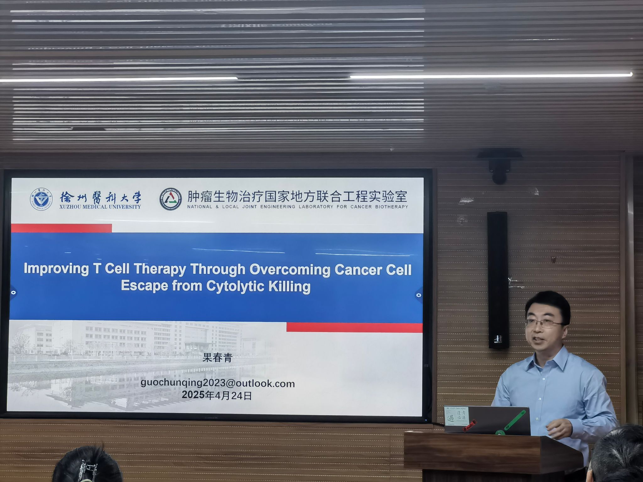 尉春艳首先代表科室对果春青教授的莅临表示热烈欢迎,并系统介绍了其学术成就:作为肿瘤免疫治疗领域专家,果教授累计在《PNAS》《Hepatology》《Nature Communications》《Cancer Research》《Annals of the Rheumatic Diseases》等国际权威期刊发表研究论文60余篇,总被引频次逾3000次。在美国工作期间,果教授承担及参与美国癌症协会(American Cancer Society)、美国国立卫生研究院(National Institute of Health)、美国国家癌症研究所(National Cancer Institute)多项重大课题。2023年作为江苏省特聘教授引进人才,加盟徐州医科大学肿瘤生物治疗国家地方联合工程实验室,牵头组建肿瘤免疫治疗创新研究团队。