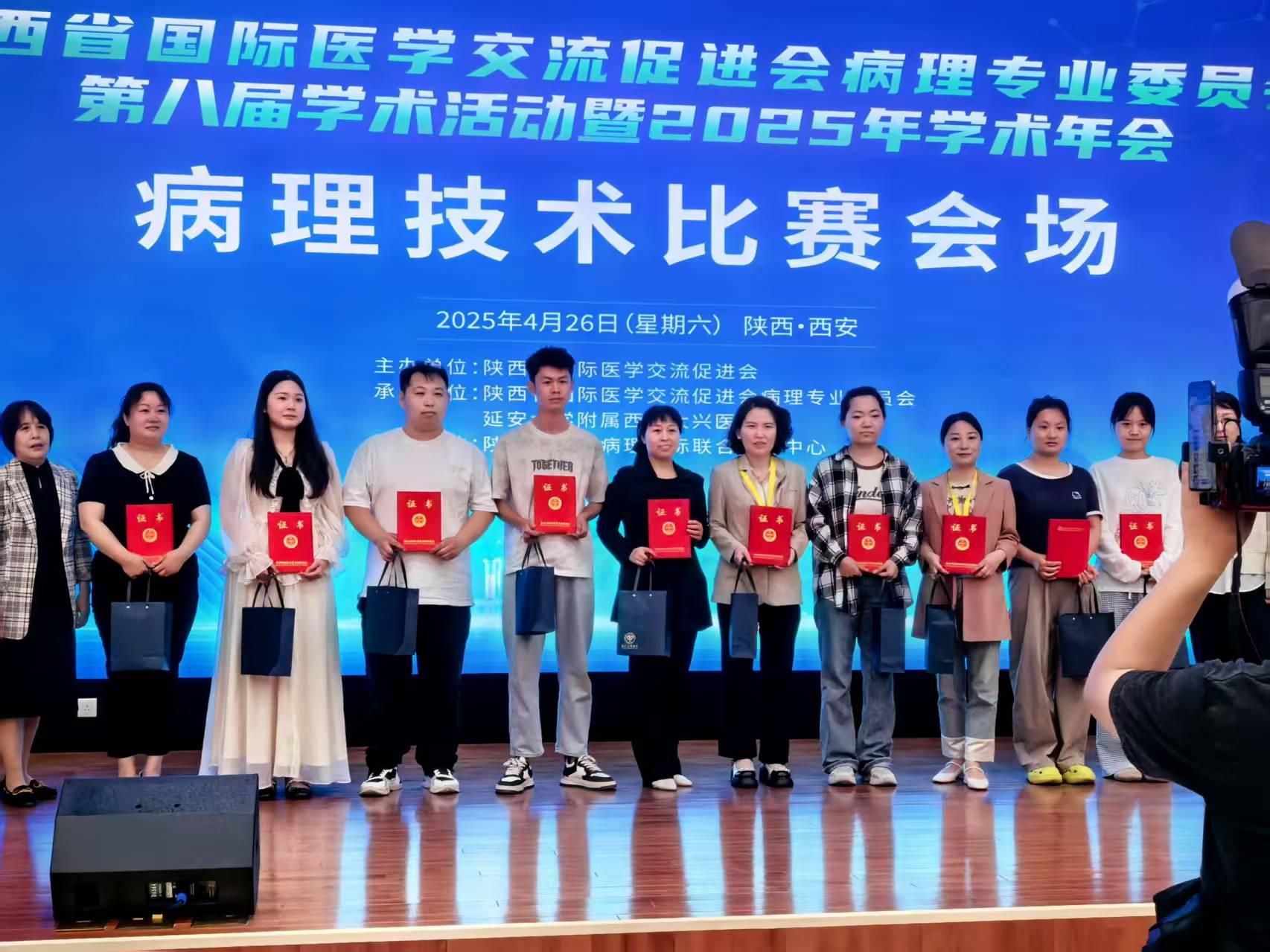 4月26日,在陕西省国际医学交流促进会病理专业委员会第八届学术年会期间举办的全省石蜡切片技术大赛中,我院病理科彭雨欣技师凭借扎实的技术功底和稳定的现场技术操作获得比赛的第一名,同时我院病理科处理的组织样本质量得到大家一致的肯定。本次比赛有省内37家大中型医院、54名技术人员参加,赛前病理科高度重视,从组织取材、蜡块择选、染色流程优化等做了严格高效的前期准备工作,彭雨欣在比赛中取得了操作时间短、切片质量高、染色效果好的优异成绩,最终经过多轮现场、镜下评分,取得了总分第一名的成绩。同时我院另一选手苏文秀也取得优秀奖的良好成绩。