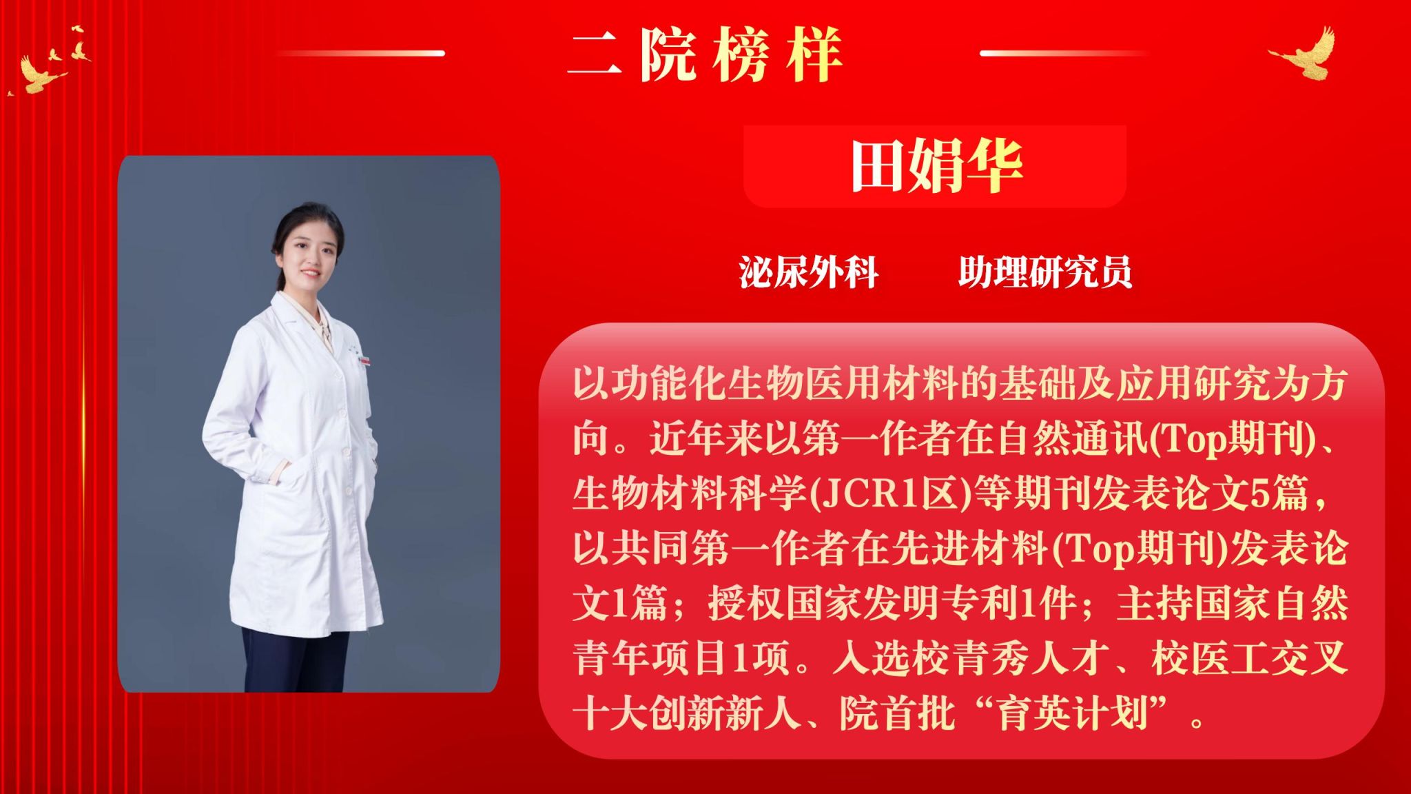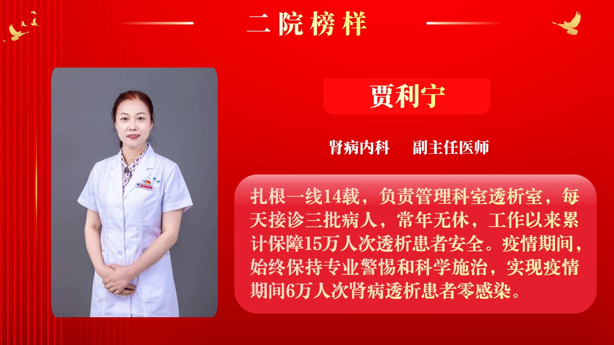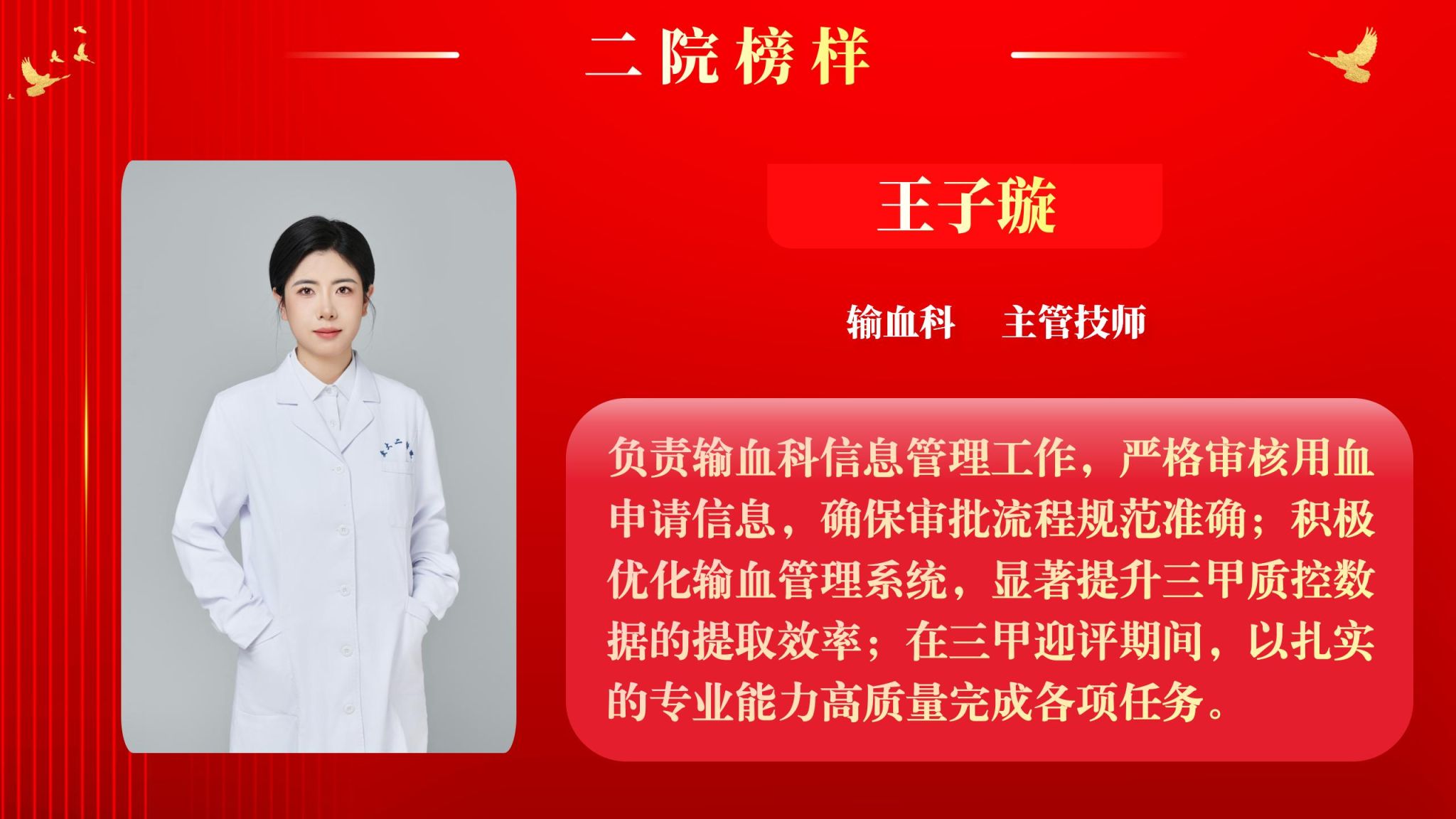 仰望星空有对标,脚踏实地有行动,平凡的是岗位,不凡的是精神。此次“二院榜样”月度人物共评选出15名,他们分别是:输血科主管技师王子璇、泌尿外科助理研究员田娟华、消化内科副主任医师李红、医务部·质量控制办公室主管技师李姗、医学检验科主管技师李思鹏、妇产科主管护师吴莉敏、骨科中心·运动医学与小儿骨科病区助理研究员宋继东、心血管内科住院医师张明、内分泌代谢科主治医师张静、呼吸与危重症医学科住院医师赵凯凯、骨科中心·脊柱与骨肿瘤病区主管护师袁翠翠、肾病内科副主任医师贾利宁、三甲办九级职员高芳、泌尿外科主治医师唐骁爽、药学部药师魏秋蕾。