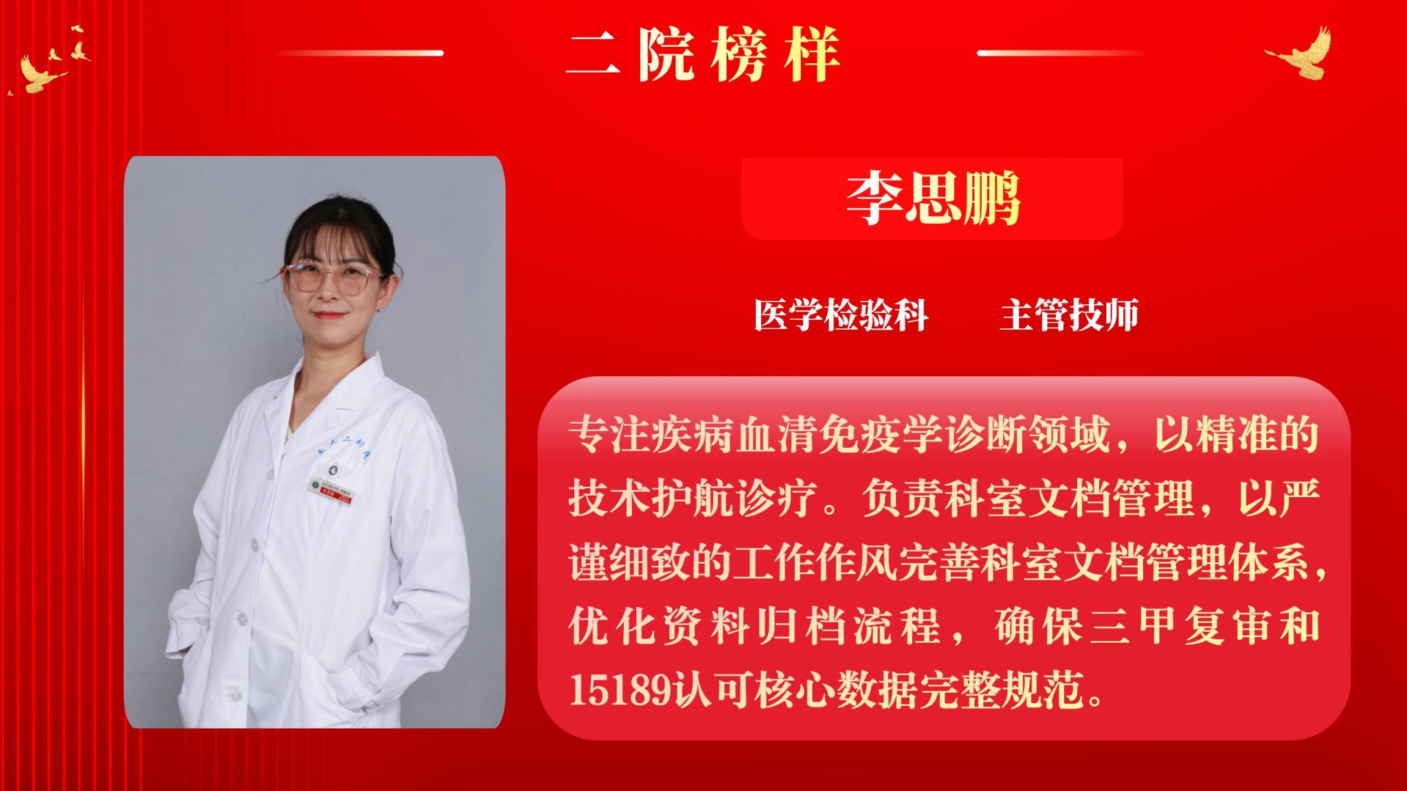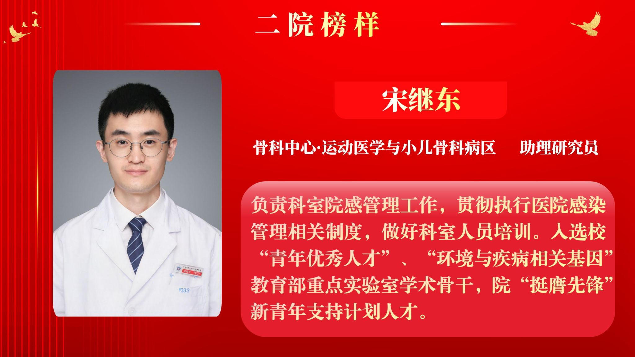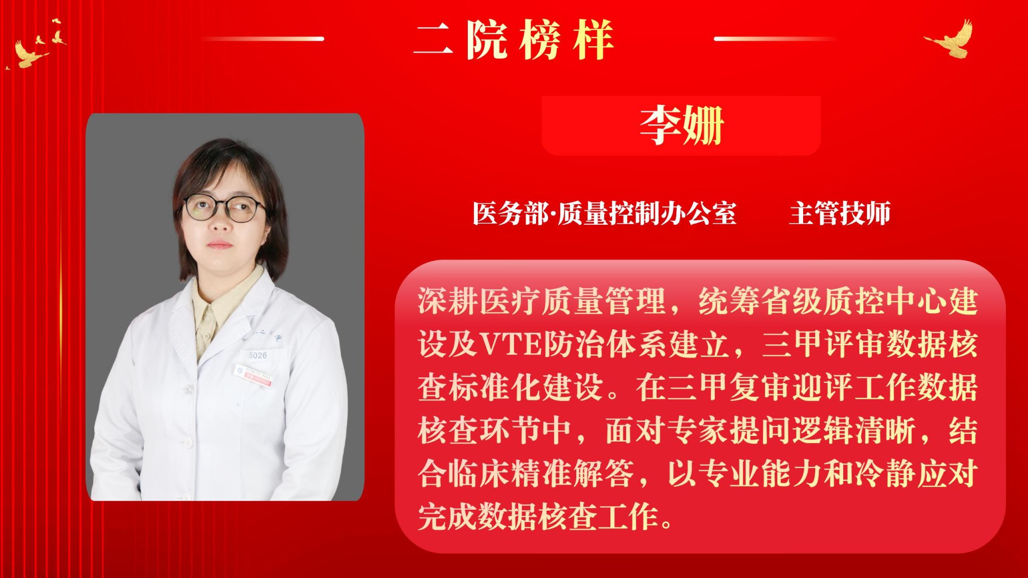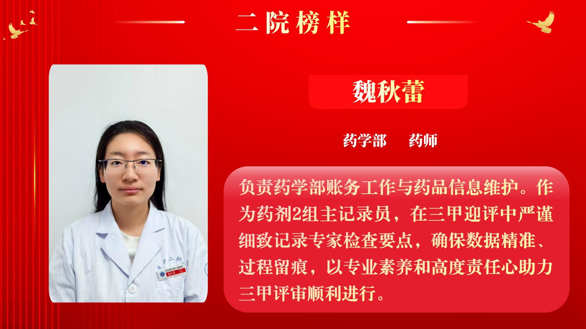 为营造全院将比学赶超融入实际工作,以奋发有为、积极进取的精神面貌迈向新征程,以“二院榜样”评选为契机,以榜样引领促进全面进步。5月12日下午,院工会在南院多功能厅举行了2025年“二院榜样”3月月度人物表彰大会,大会由党委副书记党变玲主持。