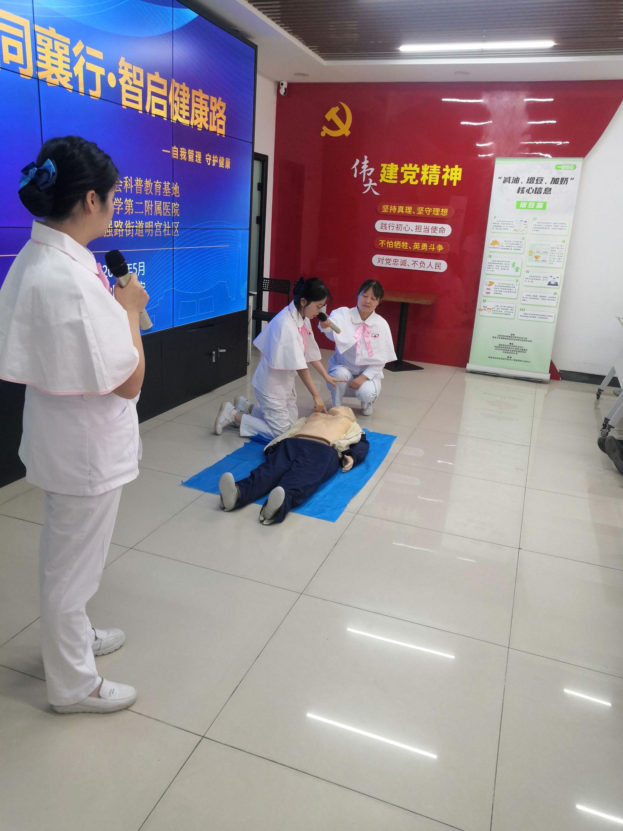 为推动健康科普知识普及,提升社区居民的健康意识和自我保健能力,在我院护理部的大力支持下,2025年5月13日上午,西安交通大学第二附属医院护理科普小组联合多个科室医护技人员走进明宫社区,开展了一场主题为“科普同襄行,智启健康路——自我管理,守护健康”的健康科普讲座及义诊活动。本次活动由西安交通大学第二附属医院主办,明宫社区协办,旨在通过专业医护人员的讲解和现场指导,帮助社区居民掌握实用的健康知识和急救技能。
