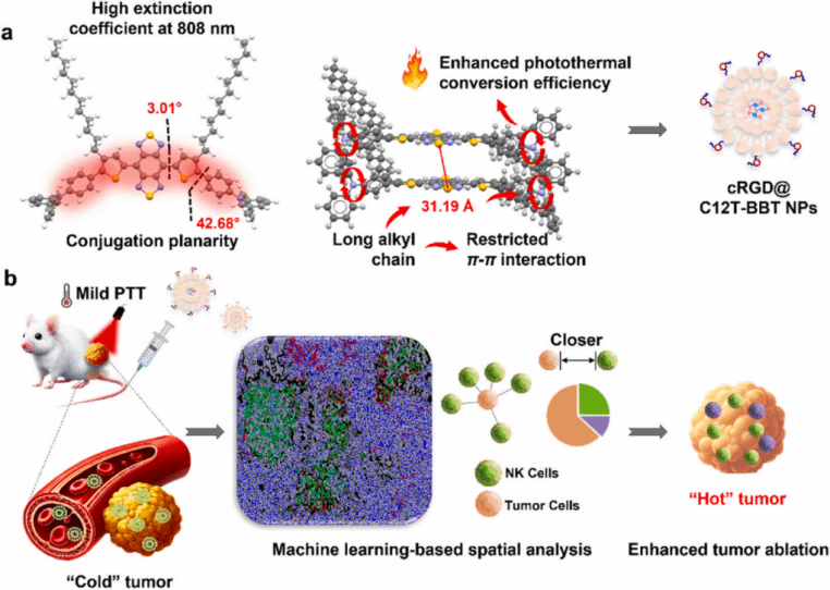 图2 (a) 设计具有长烷基链和平面结构的C12T-BBT作为NIR-II PTAs。(b) 近红外光热分子通过优化NK细胞在温和PTT中的空间分布,提升肿瘤杀伤效果