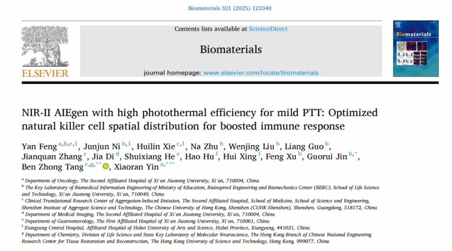 本研究是西安交通大学在医工交叉领域的重要成果,体现了学校在推动跨领域、跨学科融合以促进医学进步方面的不懈努力与执着追求。研究成果以《NIR-II AIEgen with high photothermal efficiency for mild PTT: Optimized natural killer cell spatial distribution for boosted immune response》为题,在生物医学及生物工程领域国际权威 TOP 期刊《Biomaterials》发表。第一作者为西安交通大学医学院冯焱博士,共同第一作者为西安交通大学生命科学院倪钧钧博士以及香港科技大学谢会琳博士;末位通讯作者为西安交通大学第二附属医院肿瘤内科尹晓然教授,共同通讯作者为香港科技大学唐本忠院士以及西安交通大学生命科学院靳国瑞教授。研究团队充分结合跨领域的医学专家及科学家在临床医学、材料科学、生物医学等领域的优势,长期深耕医工交叉融合领域。围绕小分子荧光染料、多功能纳米药物,开展“创新研发—机制探索—转化应用”的全链条协同攻关。