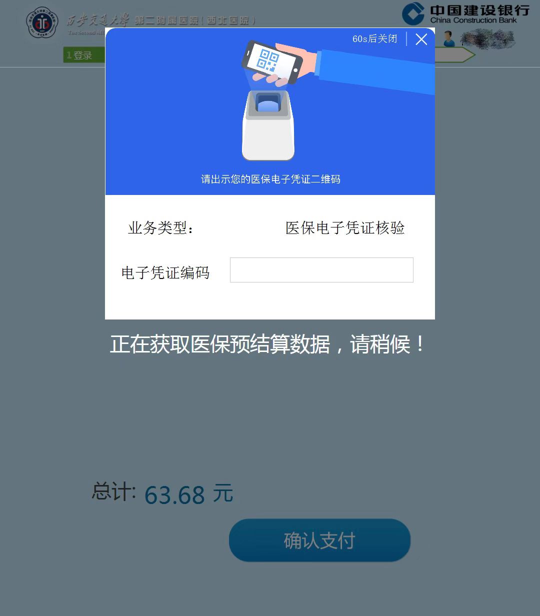 4、根据提示扫描本人医保电子凭证,社保卡个人账户余额充足时,直接完成缴费结算;余额不足时可进行混合支付,医保账户余额支付成功后,可选择使用微信、支付宝等支付方式进行补充缴费结算。