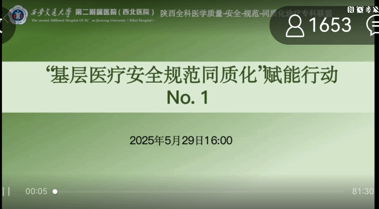 为规范基层医疗,提升基层机构临床诊疗能力及保障医疗安全,西安交通大学第二附属医院全科医学科主办“基层医疗安全规范同质化”赋能行动系列活动。作为陕西全科医学质量-安全-规范-同质化诊疗专科联盟挂靠单位,2025年5月29日,全科医学科联合单位西安市碑林区胡家庙卫生服务中心和西安市人民医院(西安市第四医院),吸引了众多基层医疗工作者和专家的参与,线上参会人员共计1653人次。