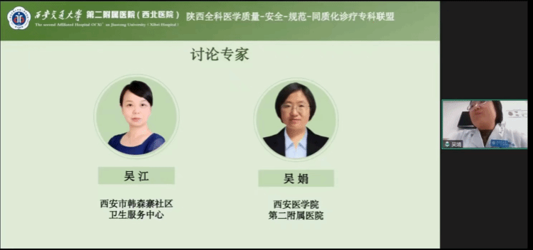 在讨论环节,来自西安市新城区韩森寨社区卫生服务中心的吴江和西安医学院第二附属医院的吴娟两位专家积极参与讨论。他们结合自身的工作经验和专业知识,对病例汇报和指南解读内容进行了深入分析和讨论,并分享了各自在基层医疗工作中遇到的挑战和应对策略。