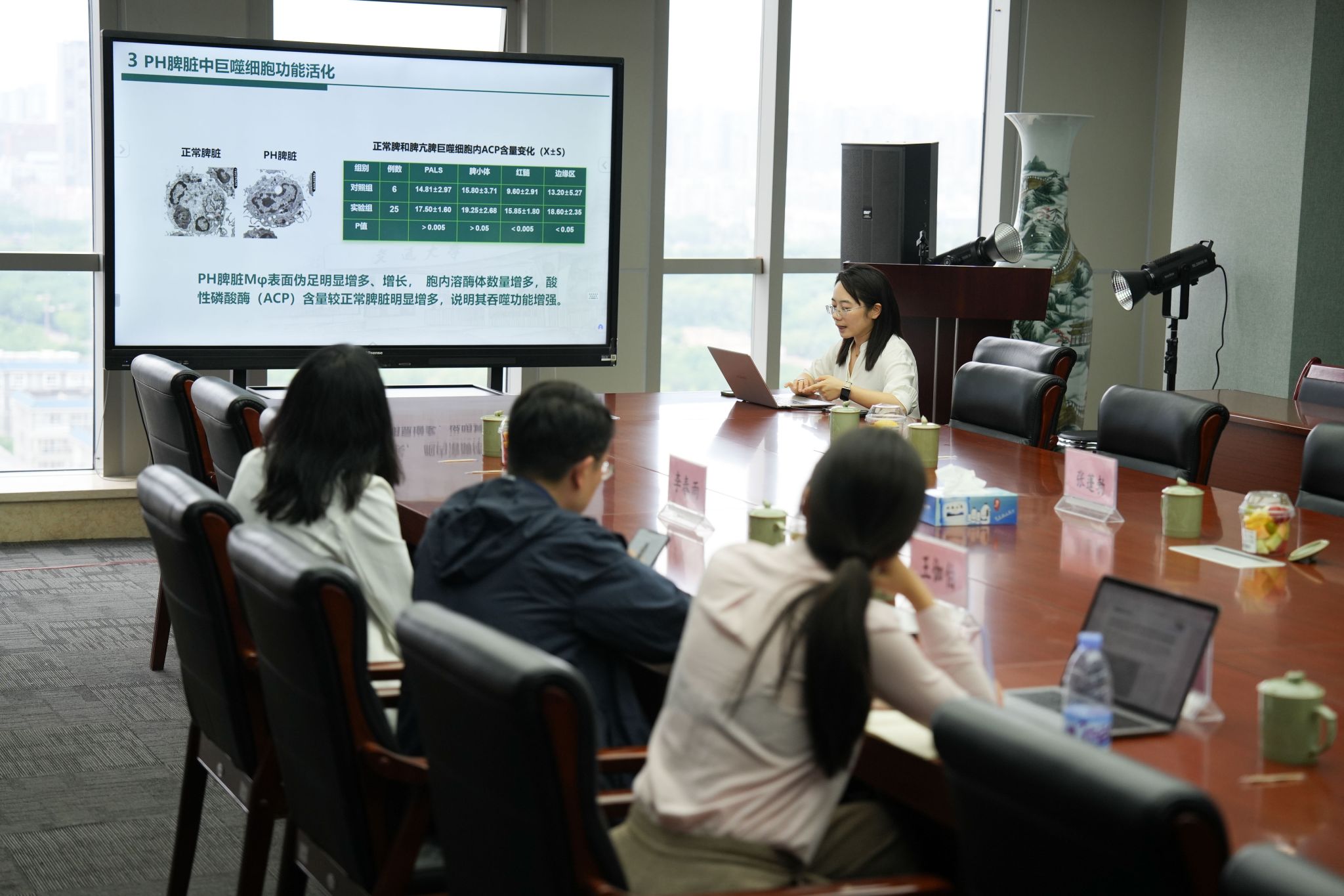 王伽伯院长主要从事中医药研究,他带领的团队在中医药领域特色明显、贡献卓越,2025年新入选国家中医药传承创新团队,与他一行还有他们团队核心成员中青年才俊-中国医学科学院肿瘤病院药剂科李春雨副主任药师及北京中医药大学生命科学学院王婧筱副研究员。张少颖博士首先代表李宗芳教授团队就其脾脏研究领域深耕37年所做的工作向王伽伯院长一行做了介绍。团队从肝硬化门脉高压患者的脾脏变化观察入手,执着坚守、创新发展,目前已拓展到脾脏与慢性肝病、脾脏与肿瘤、脾脏与慢性应激、脾脏与妊娠免疫耐受、脾脏与炎症因子风暴等脾脏“跨器官交流”多个领域,先后荣获国家自然科学基金资助31项;同时还首次建立了脾脏移植、脾脏特异性光转换等脾脏细胞追踪技术、用于细胞在脾脏与其它器官间的交流研究,将多组学、医工交叉、人工智能等研究手段融入脾脏参与其他疾病发生发展机制探究;并对多年前李宗芳教授首次提出的“调脾治病”理论进行了再解读、对近年来团队借助物理手段干预脾脏调节脾脏功能实现疾病治疗设备研发及临床研究进行了分享。