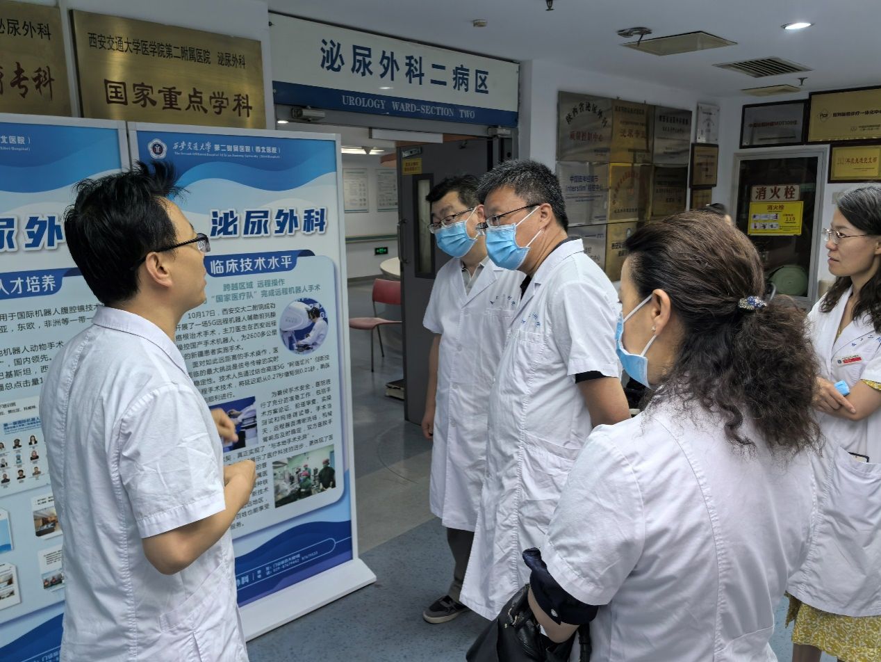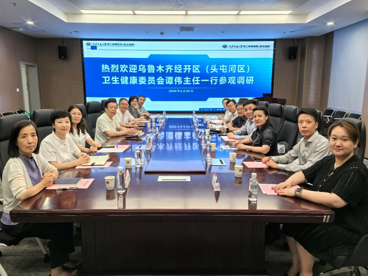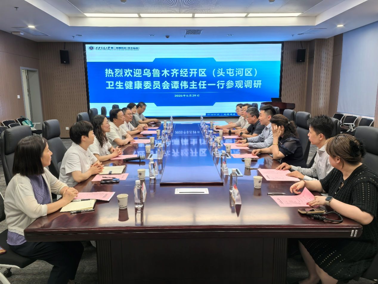 2025年5月29日下午,乌鲁木齐经开区(头屯河区)卫生健康委员会党组副书记、主任谭伟,第二人民医院党委书记陈龙,第一人民医院党委委员、副院长古娜依・色义提,卫生健康委员会业务一科科长马茜惠梓一行莅临我院参观调研。西安交通大学国家大学科技园产学研合作中心主任窦路炜、成果转化专员张双丽,西安交通大学医学部医院管理处干事李佳念,西安交通大学第二附属医院院长张蓬勃、副院长刘明、党委办公室副主任徐晶、护理部副主任姚聪、教务部王玲珠、科研部李文江参会。座谈会在干部楼六楼新会议室举行,由医务部副主任同艳妮主持。
