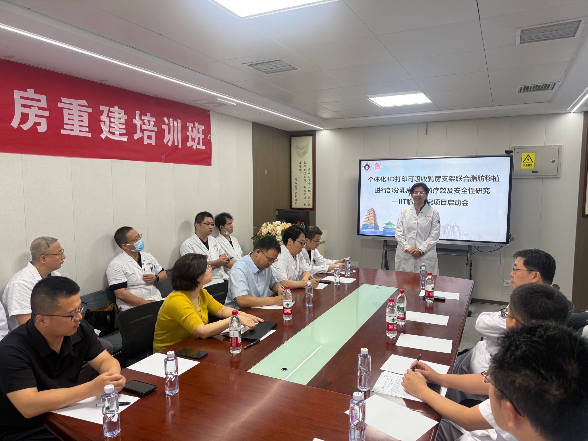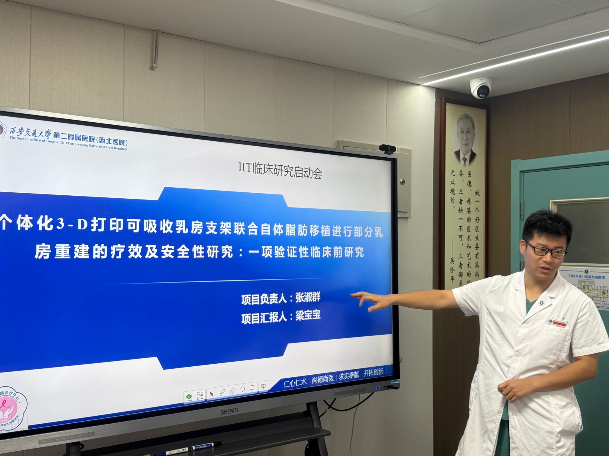 2025年6月6日,西安交通大学第二附属医院乳腺疾病诊疗中心团队与西安交通大学机械工程学院贺健康教授团队联合启动了一项创新性临床研究——“个体化3D打印聚己内酯(PCL)可吸收乳房支架联合自体脂肪移植(AFG)行乳房部分重建”。作为国内首个针对术中个体化3D打印即刻乳房部分重建及术后自体脂肪移植的创新疗法验证性研究,该项目旨在解决20%-50%乳房容积缺失的修复难题,填补国产可吸收乳房支架临床应用的空白,推动乳腺疾病治疗向精准化、个体化发展。研究启动会在西安交通大学第二附属医院乳腺疾病诊疗中心举行。