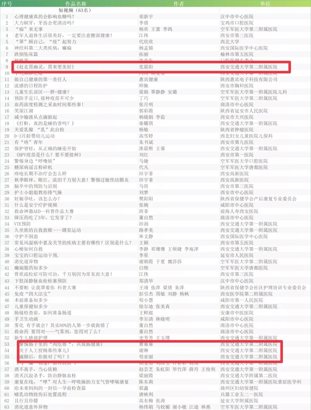 近日,第二届“健康陕西·科普能力提升在行动” 健康科普作品征集大赛评选活动在西安落下帷幕,由院团委推选的6部视频作品分别荣获专题类一等奖1项、短视频类二等奖1项、短视频优秀奖4项。