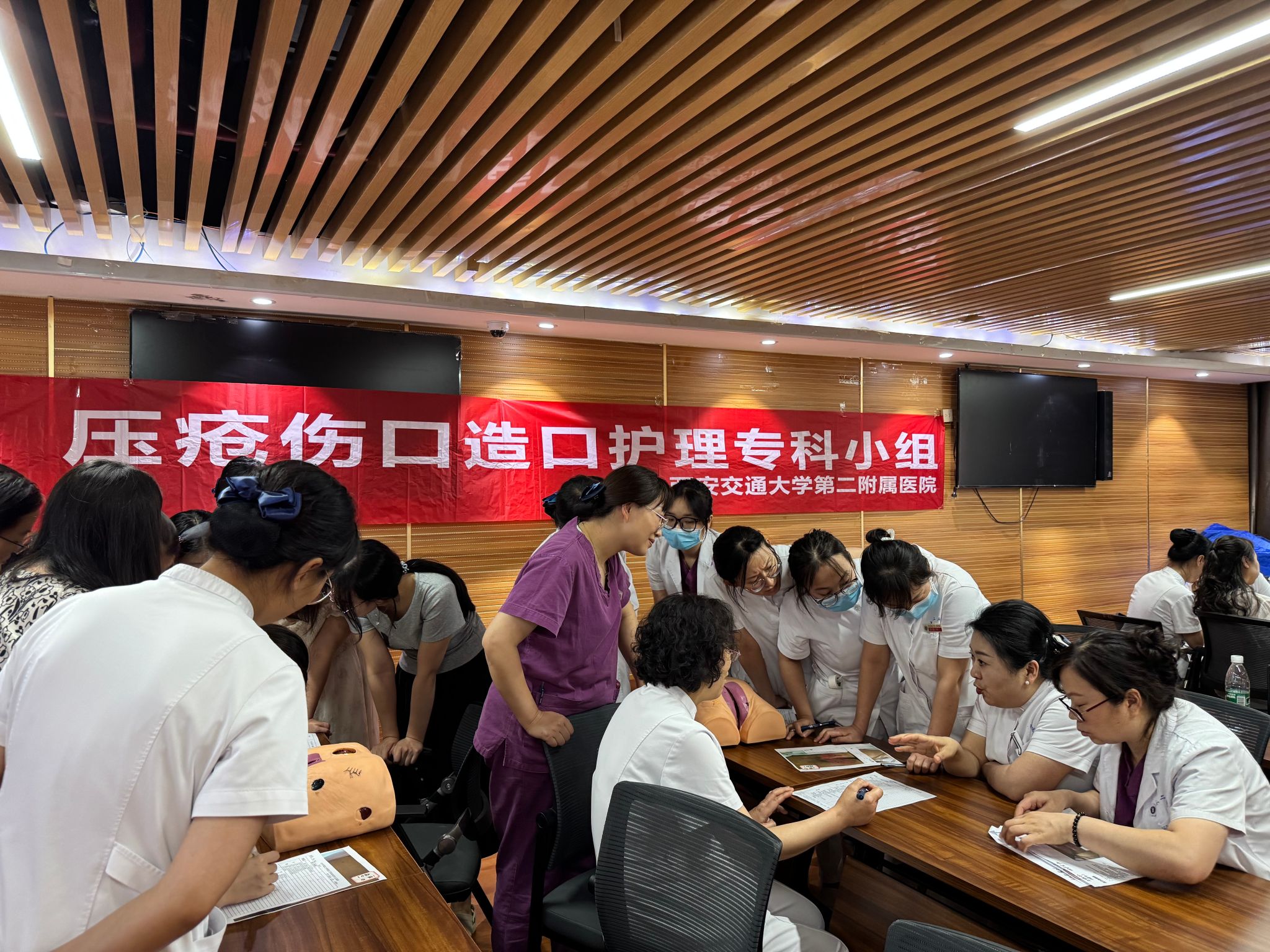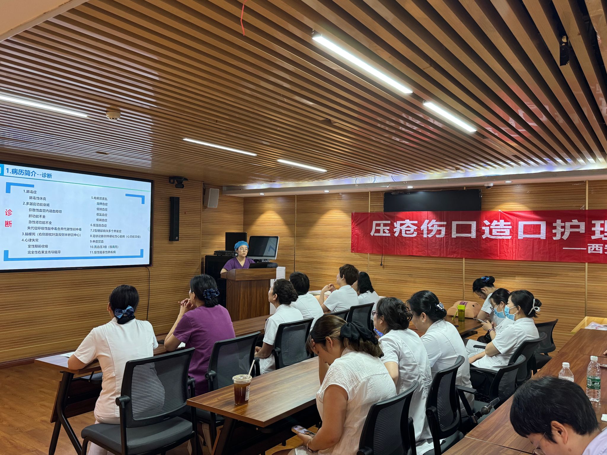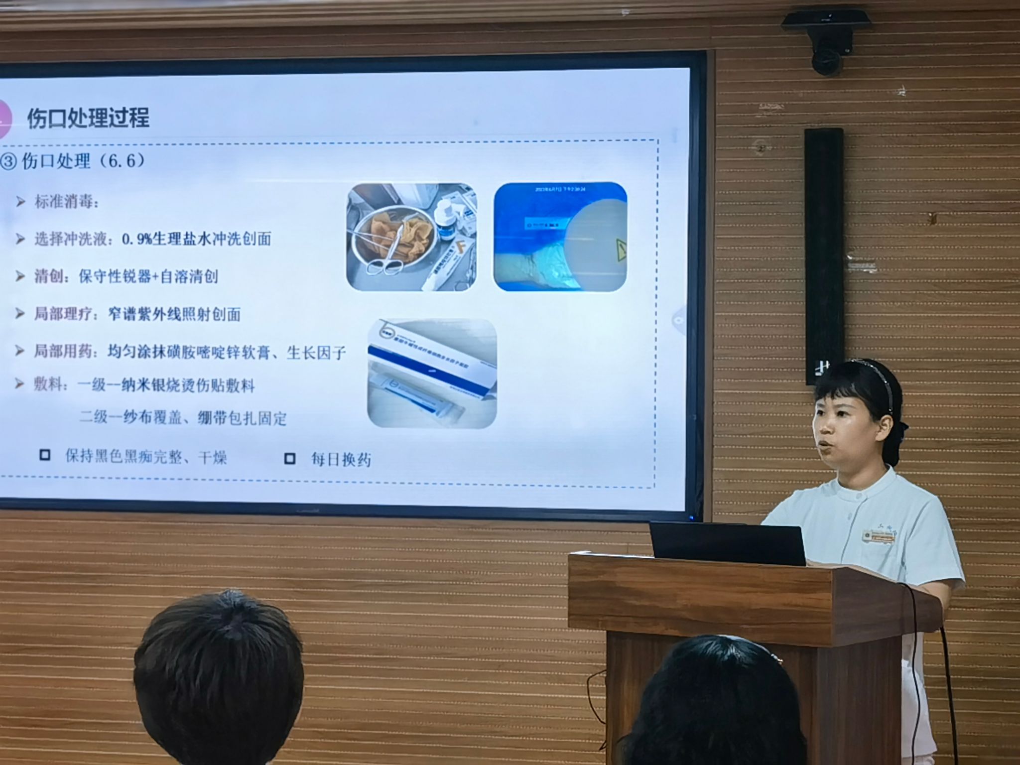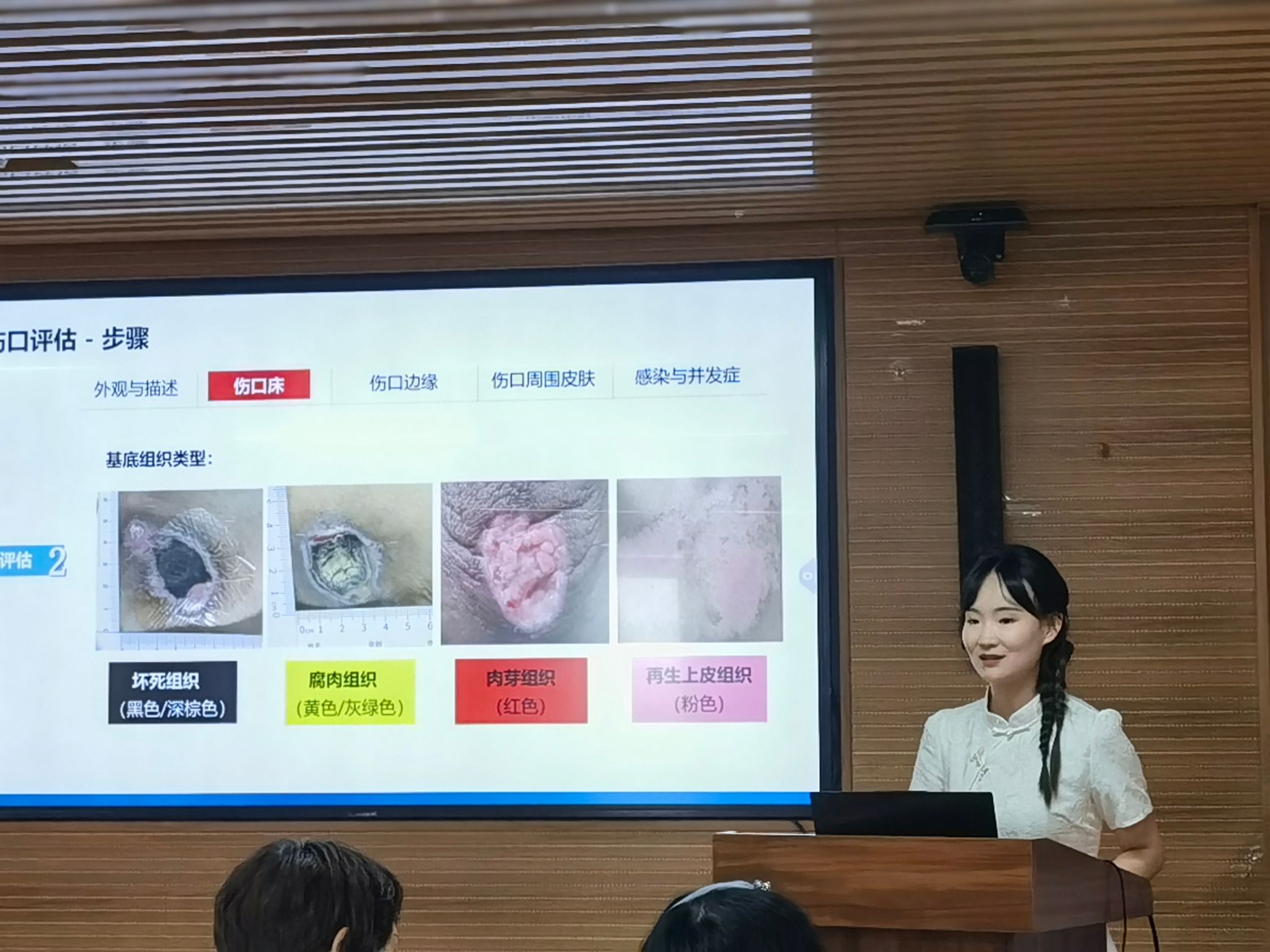 为强化理论转化能力,会议设置压疮工作坊环节,以练促学、夯实基础。压疮伤口造口专科护理小组由王金娟副护士长主讲《2025年压疮伤口工作坊方案》,详细明确操作流程、目标和要求,并围绕伤口评估、伤口床准备及处理等内容进行指导,为后续实操提供明确方向。
