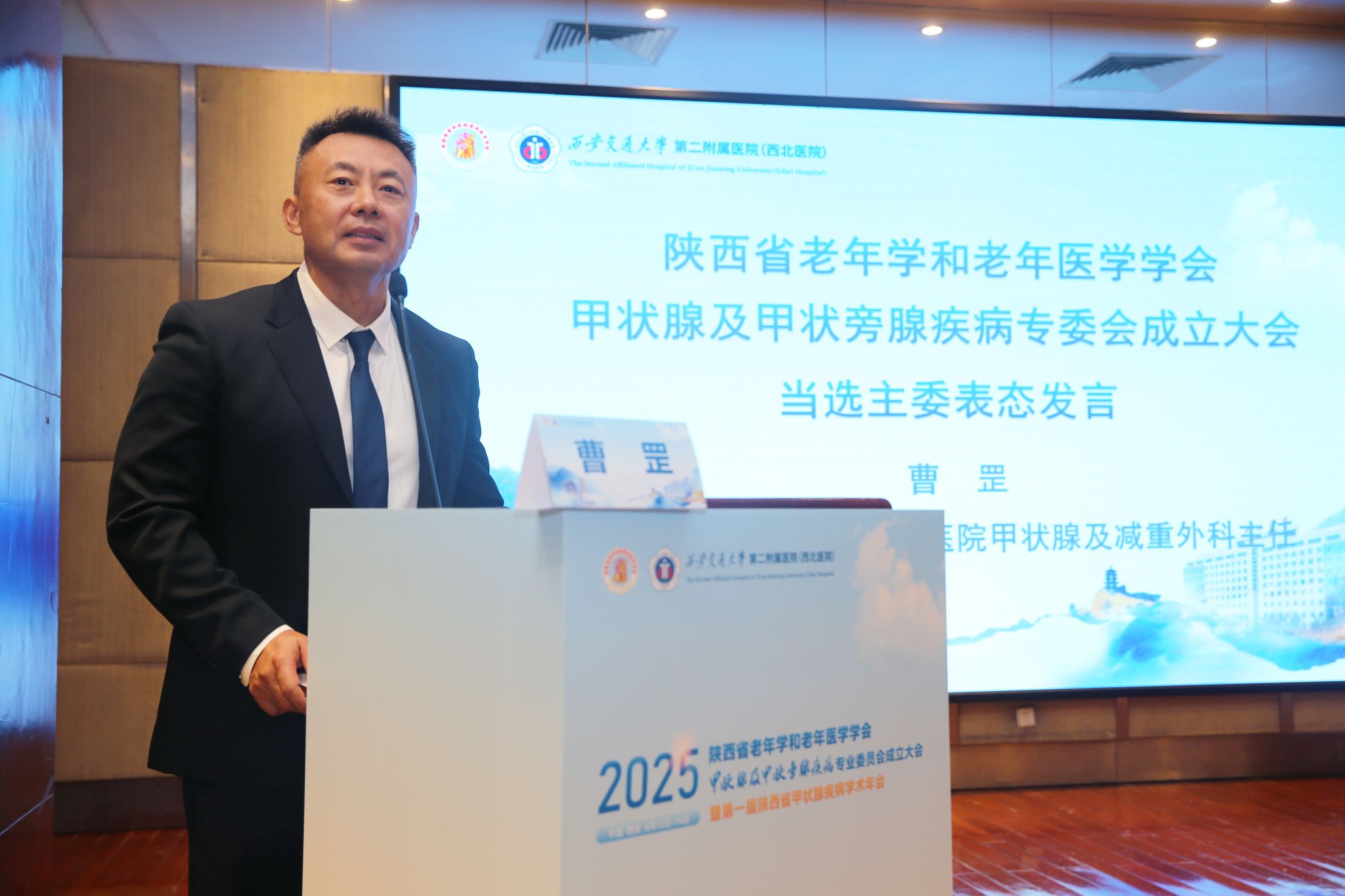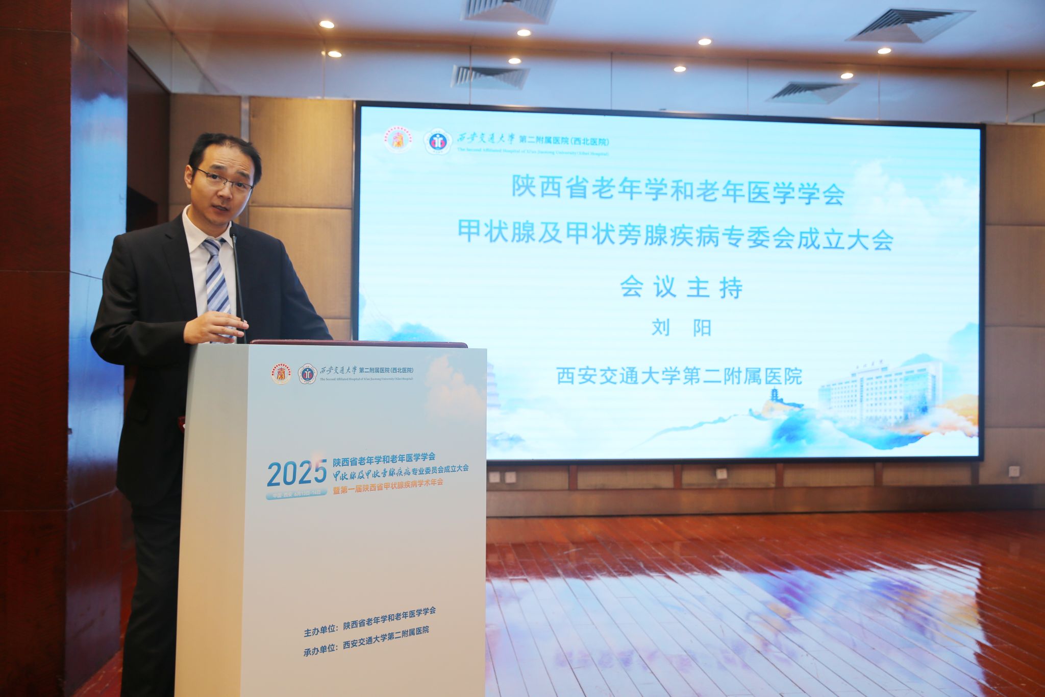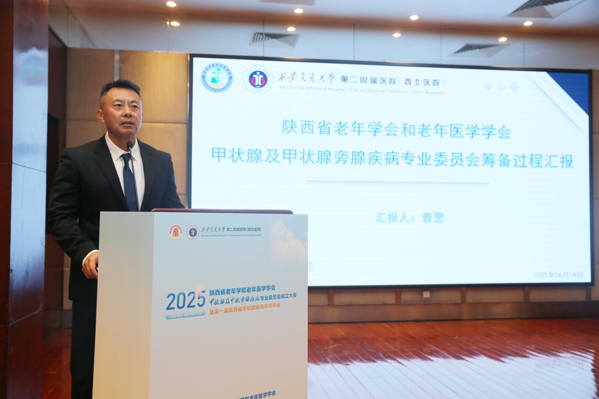 会议伊始,甲状腺及减重外科主任曹罡教授对甲状腺及甲状旁腺疾病专业委员会筹备工作进行了全面汇报。他向陕西省老年学和老年医学学会对我院的信任与支持致以诚挚谢意,并郑重表示,西安交大二附院甲状腺及减重外科作为主委单位,将充分发挥学科优势,依托专委会平台,积极推进青年医师规范化培训,完善传帮带人才培养体系,致力于为行业培育复合型医学人才;同时积极拓展国际学术交流合作,全方位提升甲状腺及甲状旁腺疾病诊疗水平。
