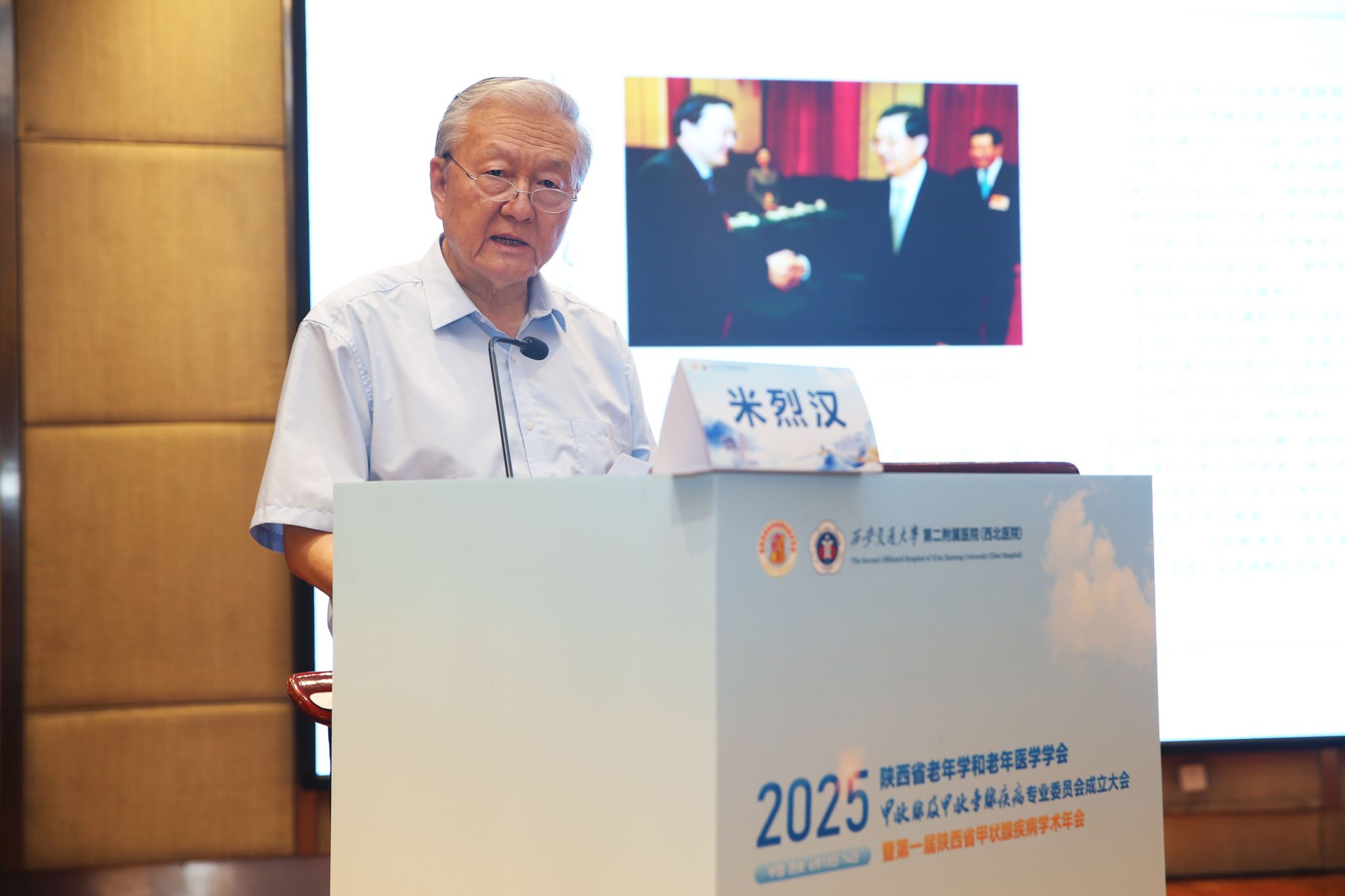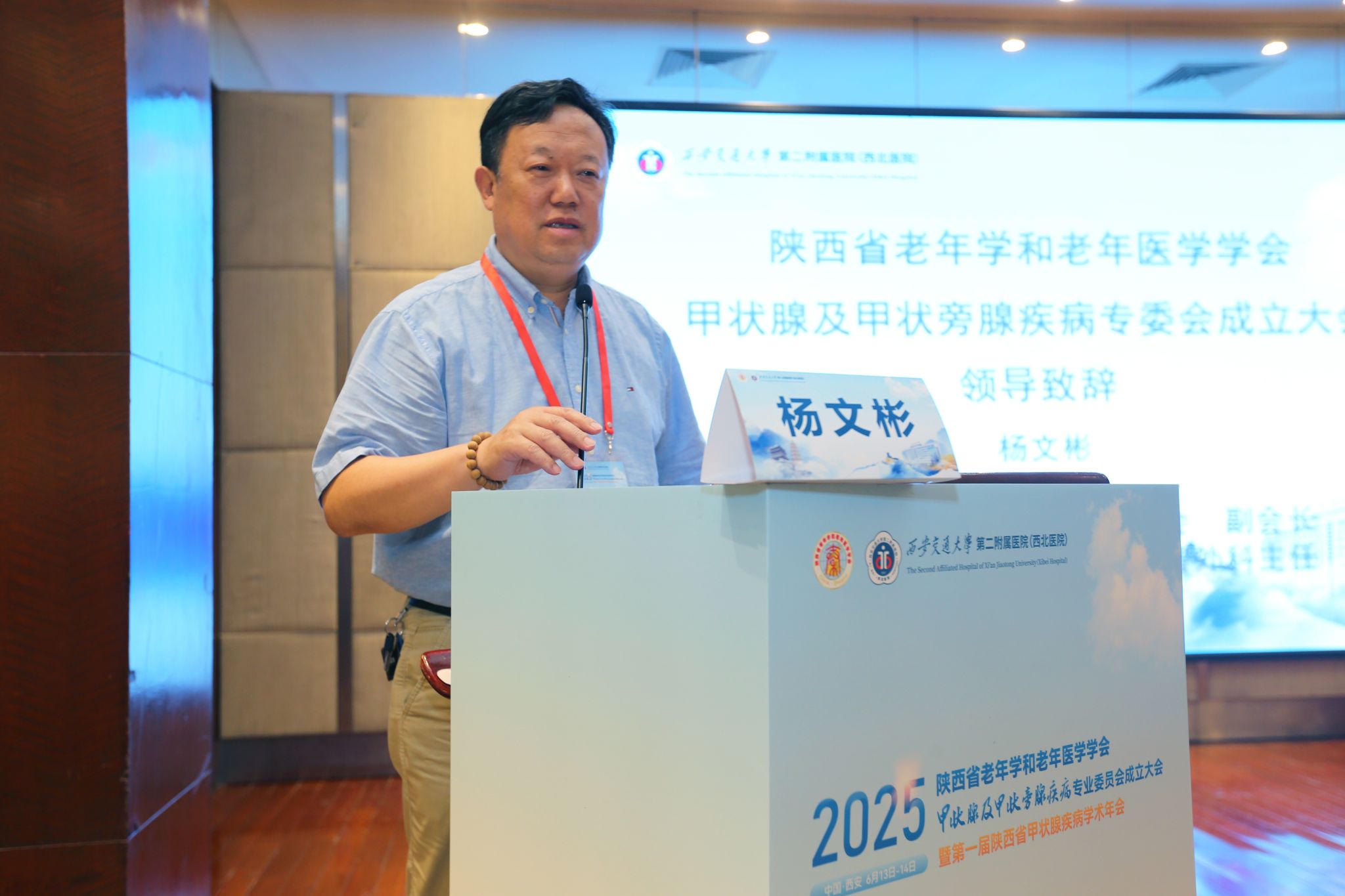 米烈汉会长在讲话中着重强调了老年健康问题在人口老龄化背景下的重要性。他指出,甲状腺及甲状旁腺疾病作为老年人群常见多发病,严重影响老年人生活质量,且该类疾病隐匿性强、易误诊漏诊,给老年健康保障带来挑战。米会长充分肯定了我院在甲状腺及甲状旁腺疾病诊疗、科研和教学方面的突出成果,特别是在微创手术、多学科协作及疑难重症诊治领域的领先优势,并对专委会提出深化中西医结合、强化多学科协作、提升基层服务能力、加强科研创新等工作要求,期望专委会以科技创新为驱动,全方位提升甲状腺及甲状旁腺疾病诊疗水平,为三秦老年患者健康福祉贡献力量。