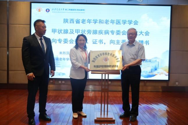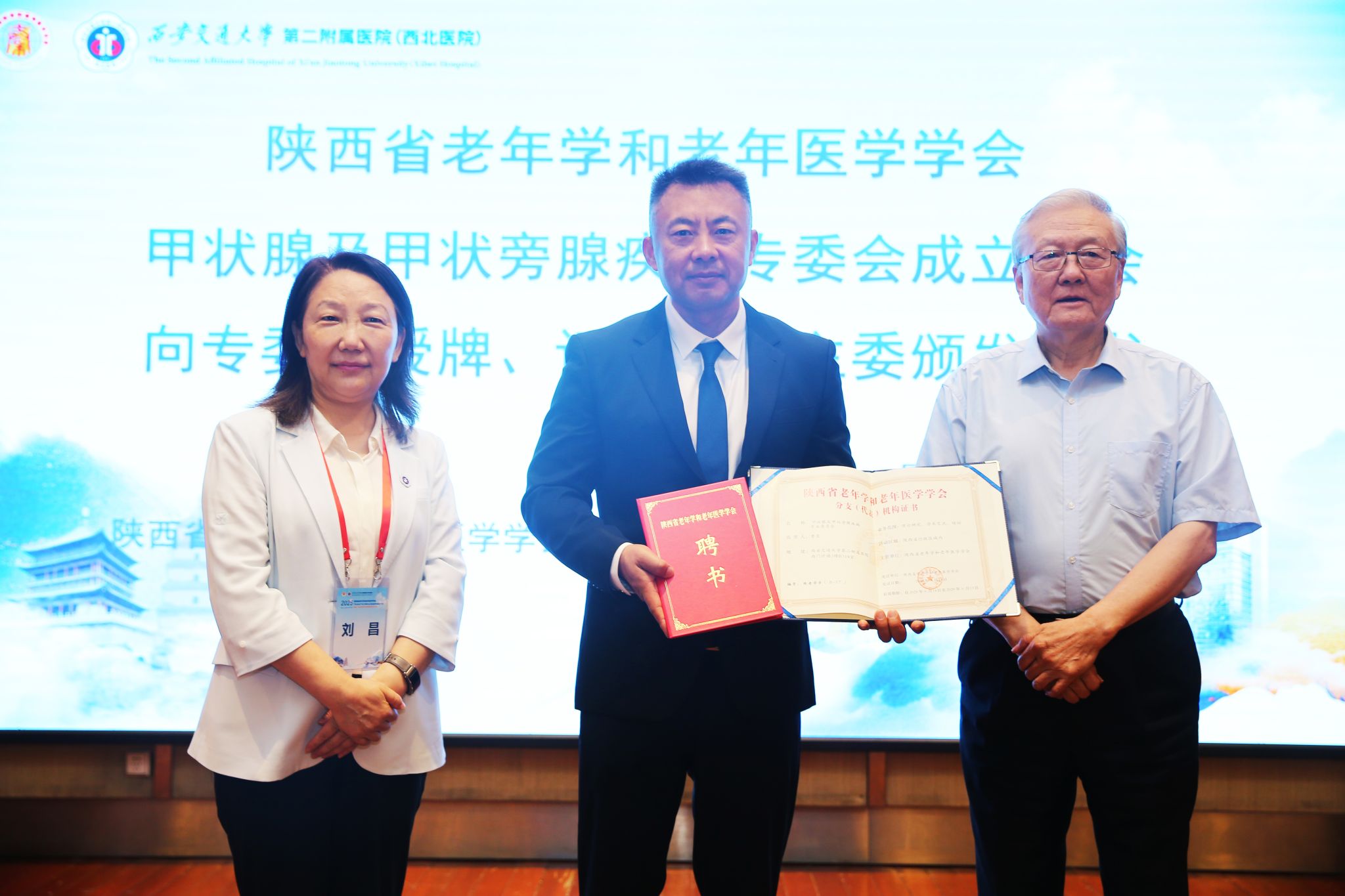 随后,陕西省老年学和老年医学学会常务副会长兼秘书长宜福田介绍了学会发展历程及近年来的重点工作成果。副会长杨文彬教授代表省学会宣读了关于批准成立甲状腺及甲状旁腺疾病专业委员会的批复文件。在宜福田常务副会长兼秘书长的主持下,大会通过线上线下扫码无记名投票的方式,选举产生了第一届甲状腺及甲状旁腺疾病专业委员会。专业委员会共有委员306人,其中其中主任委员1名,副主任委员14名,常务委员51名。曹罡教授高票当选为主任委员;安媛、董鹏、刘阳等14位专家当选为副主任委员;同时,我院血管外科主任马建仓教授受聘担任专委会名誉主委。陕西省老年学和老年医学学会米烈汉会长与西安交通大学第二附属医院党委书记刘昌教授共同为专委会授牌,并向主任委员、副主任委员颁发证书与聘书,现场氛围庄重热烈。