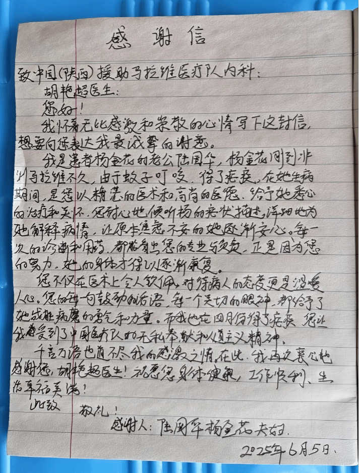 45岁的王女士(化名)赴非探亲期间突发高热寒战,初期在外院误诊为胃炎而导致她没有得到及时治疗,病情急剧恶化。她出现了意识模糊、大小便失禁、无法进食,甚至无法辨认亲人,克氏征阳性,生命垂危,家属紧急求助中国医疗队胡艳超医生。面对极其复杂的病情,胡艳超医生凭借扎实的专业功底和丰富的临床经验,判断患者为及其凶险的脑型疟疾合并败血症,由于姆祖祖当地医疗条件不足,诊治面临巨大挑战。胡艳超医生不分昼夜地守护在病床前,根据病情变化随时调整治疗方案。治疗过程中,患者因神经系统受损,同时对自身疾病的不确定性充满恐惧,一度情绪崩溃、拔针拒治,胡艳超医生耐心安抚躁动不安、口齿不清的患者,重新建立静脉通路,坚守两小时直至患者情绪平稳接受治疗后才离开。王女士在五天后奇迹般恢复神志和意识,认出了亲人;第七天,她在家人搀扶下重新站立行走;第十天,她康复出院。在感谢信中,王女士饱含深情的写道:“是胡艳超医生给了我第二次生命,没有她,我早已客死他乡!”字字句句都饱含着重获新生的至深感激。