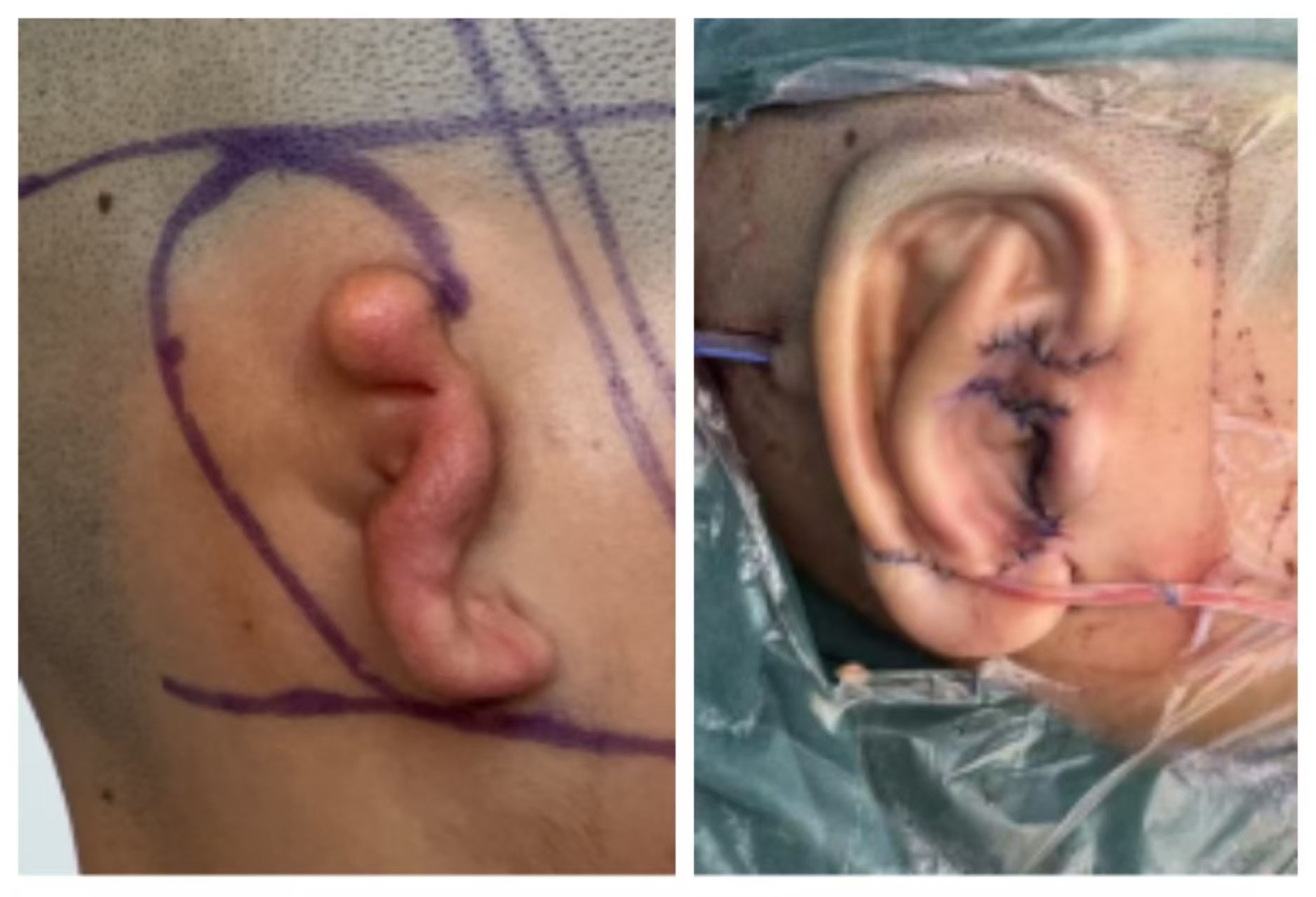 术中, 在麻醉科和手术室的配合下,高滢团队取患儿对侧 6-8 肋软骨,雕刻并缝合成耳软骨支架,分离残耳软骨,皮瓣成型后将耳软骨支架缝合固定于耳部对称位置,采用负压成形技术确保耳廓三维结构。术后亮亮恢复良好,无耳鸣、无眩晕、无听力下降、无面瘫、无舌体麻木和味觉异常。