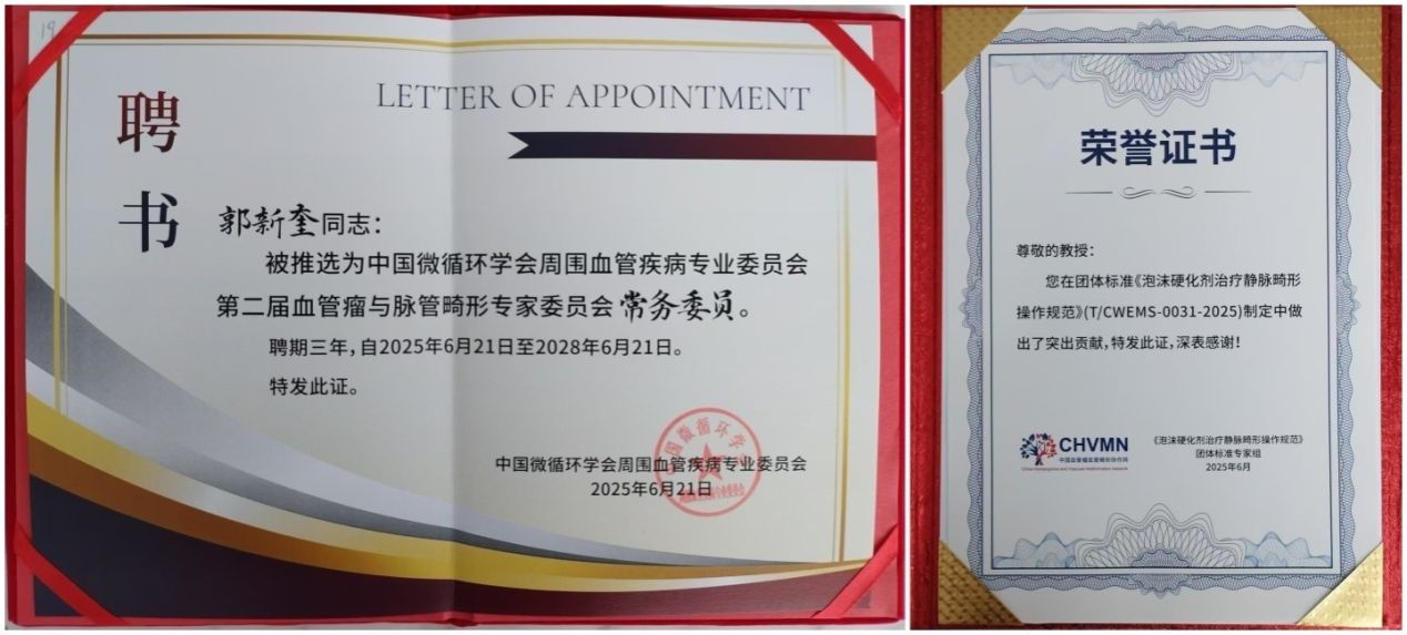 郭新奎教授连获三项重要任职:中国医师协会儿科分会儿童介入学组委员、中国微循环学会血管瘤与脉管畸形专家委员会常务委员、中国儿童血管瘤血管畸形联盟副主任委员