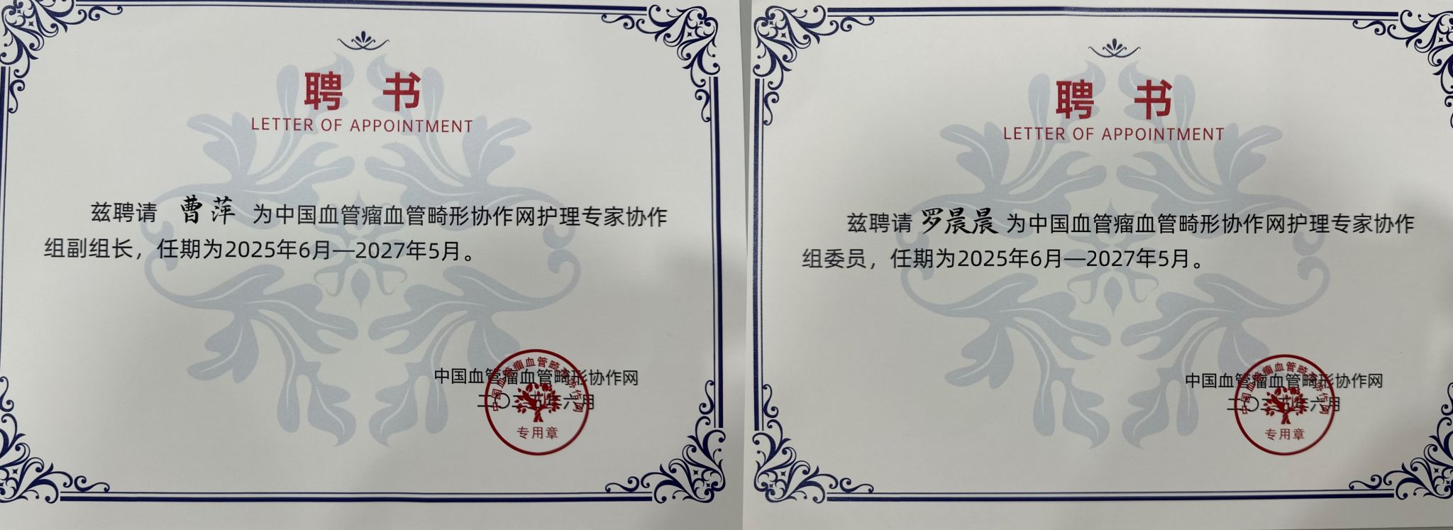 曹萍护士长当选首届中国血管瘤血管畸形护理专家协作组副组长,罗晨晨护士获聘委员,实现我院儿科护理在全国专科护理领域的历史性突破。