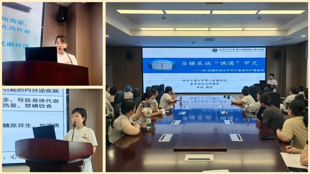 首先由老年内分泌代谢科李瑶、周青两名主管护师讲解《当糖尿病"偶遇"甲亢——1例2型糖尿病合并甲亢患者的护理查房》,借助临床真实病例展示了内分泌代谢疾病的复杂管理,还特别强调了糖尿病合并甲亢危象患者的识别与处理。案例通过循证思维从症状识别、实验室指标解读到热量摄入冲突的处理,系统讲解了两种疾病并存的护理要点(如饮食指导、心率监测等),为临床处理此类疑难病例提供了可复制的经验。