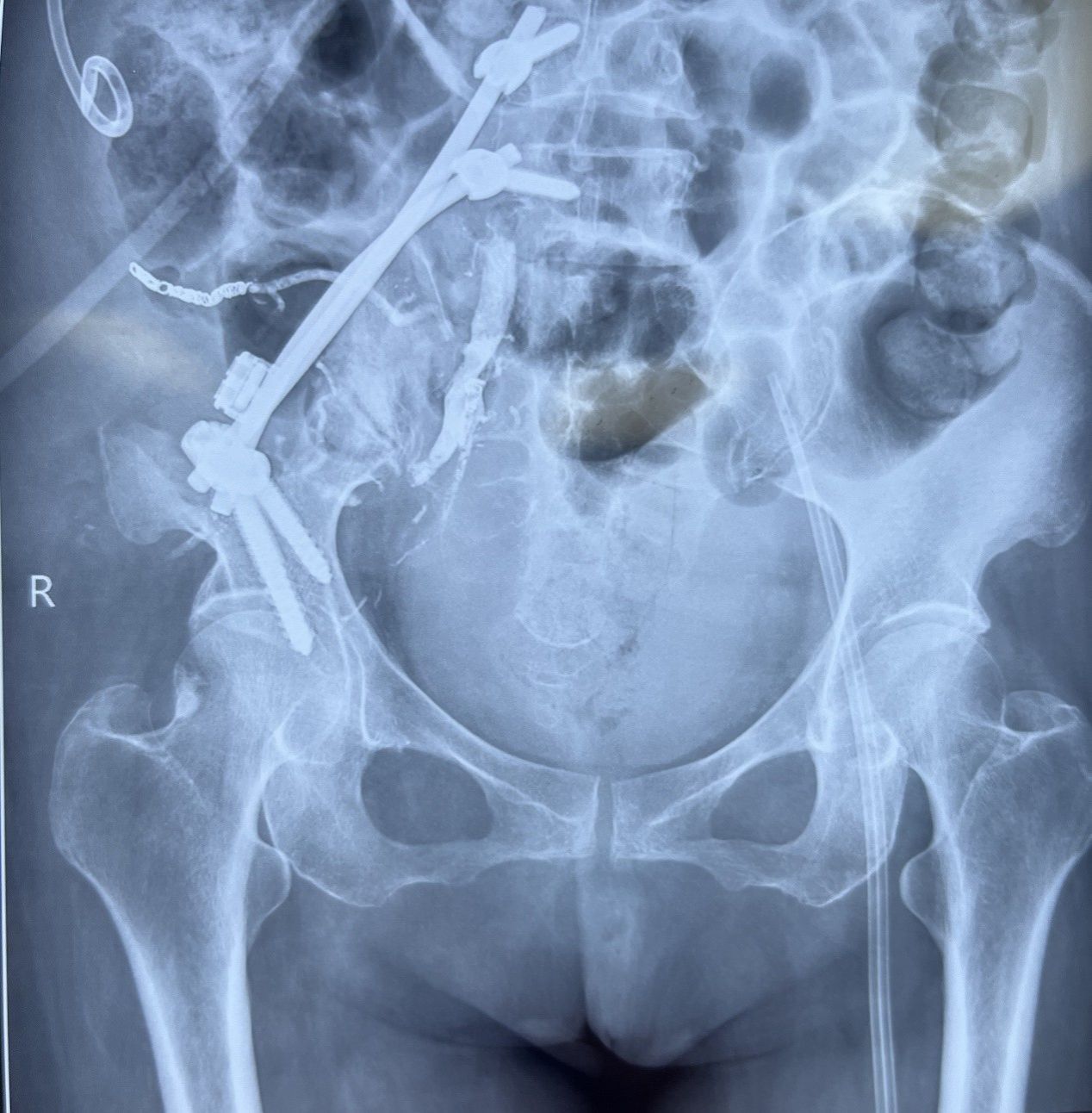 手术当日,在首席专家骨科主任医师王栋教授的统筹指挥下,多学科专家紧密协作,血管外科专家首先经介入栓塞了肿瘤供血血管降低术中出血;骨科团队王国毓教授治疗组则在神经监测仪的实时保护下,小心翼翼地分离被肿瘤侵犯的血管神经丛,最终将这一巨大瘤体连同受侵的骶骨、髂骨完整移除。随后,团队利用脊柱骨盆钉棒系统成功重建了骨盆环的稳定性。手术全程出血量得到有效控制,患者生命体征平稳。