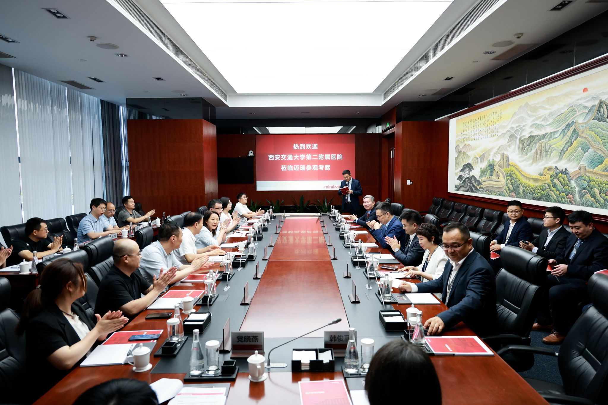 在参观了产品展厅及数智化医院展厅之后,双方进行了讨论交流。刘昌书记高度赞扬迈瑞在超声、监护以及临床检验等方面取得的成就,介绍了二附院的发展史、取得的成就以及未来发展方向,重点介绍了西安交大依托创新港实施“6352”工程和“1121”产教融合创新模式,扎实推动教育、科技、人才一体化发展的创新实践。医院将持续深化与企业的产学研用深度融合,推进学科交叉融合,推动医用机器人、医用大模型、脑机接口等技术研发与应用,为国家实现高水平科技自立自强贡献力量。双方就慢性肝病在超声应用领域全省的质控和病历讨论平台搭建、设立省级科技项目、生命信息支持类设备的物联信息互通、联合申报国家级省部级课题、医疗收入结构的转型、“一带一路”医疗合作等方面达成合作意向。