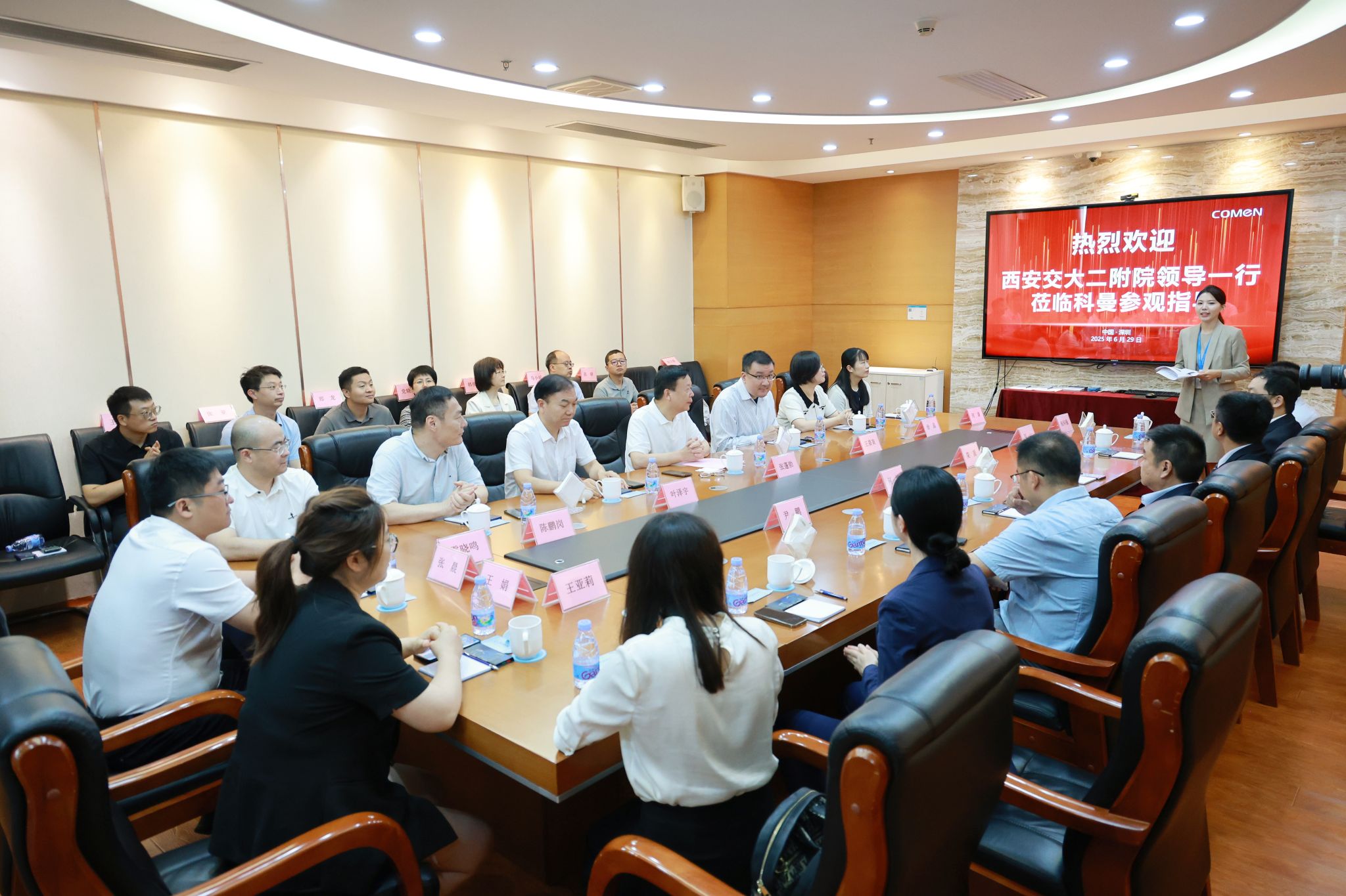 为落实校党委书记卢建军来院调研讲话精神,依托中国西部科技创新港实施“产教融合、协同育人”工程,探索产学研深度融合新模式。医院主动融入学校发展大局,以自身高质量发展助力国家医学中心、国家医学攻关产教融合创新平台建设,坚持临床牵引的医工交叉、医教研产深度融合的发展思路,以高质量临床牵引高水平科研,高水平科研支撑高质量临床。2025年6月28日-29日,党委书记刘昌、院长张蓬勃和副院长王嘉寅,带领医院国有资产与医学装备管理办公室、医院办公室、科研部、急诊科、重症医学科、超声学科、麻醉科、医学检验科、核医学科、学科建设办公室、医务部、信息网络部、党委宣传部等学科主任及科研骨干团队,前往华为、迈瑞及科曼深圳总部进行战略合作交流。此举是二附院在持续推进医用机器人研究、医用大模型研究、脑机接口研究等工作之后,进一步加强医工交叉融合、促进科研成果转化,推进院企合作的新举措。